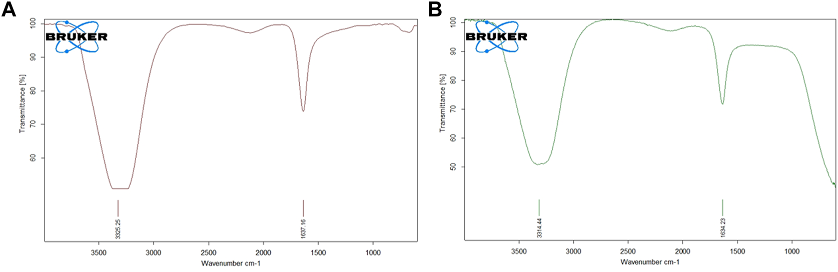 FTIR analysis is crucial for the identification of the functional groups that are present in the AuNP-PHF and AuNP-Dox. The FTIR spectrum of AuNP-PHF and AuNP-Dox were recorded in the spectral region 3000–300 cm−1 and were depicted in Figure 3. The FTIR spectrum of AuNPs conjugated with PHF and Dox showed the O-H symmetric stretching vibration frequency of phenols at 3325 cm−1 for AuNP-PHF and 3315 cm−1 for AuNP-dox, signifying the presence of alcohol. Additionally, the presence of the N-H bond of primary amines was recorded at 1637 cm−1 for AuNP-PHF and 1634 cm−1 for AuNP-dox, suggesting the presence of an amide group. The obtained results demonstrate that the amide and phenol groups of the drugs formed a layer on AuNP, thereby serving as a capping agent protecting AuNP from agglomeration leading to enhanced stability of AuNPs.
