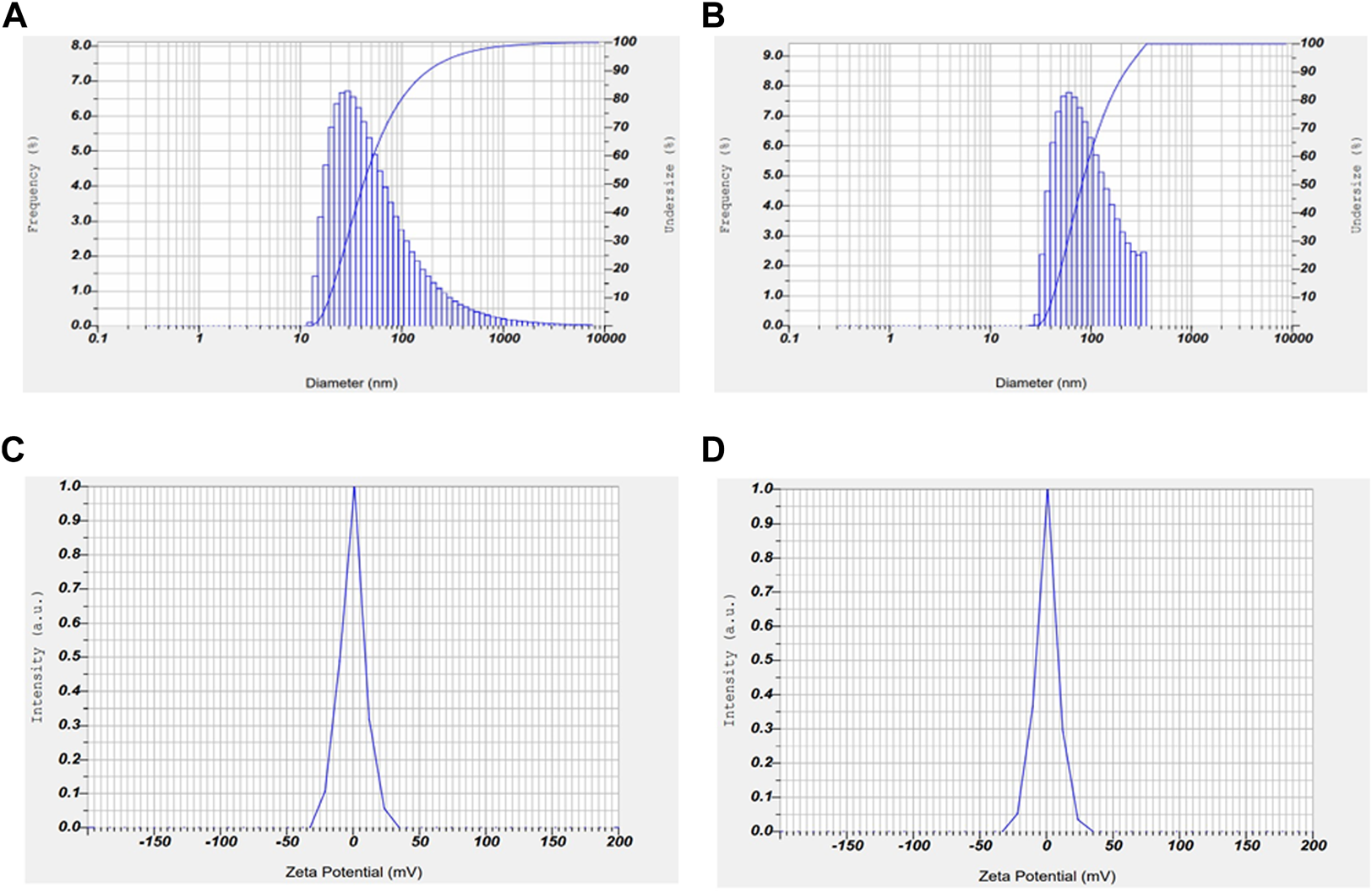 Graphical representation of zeta potential and particle size of AuNP-PHF and AuNP-Dox. To check the stability and particle size of the drug loaded nanoparticles, Zeta potential and particle size analysis was carried out using DLS. As shown in the above figure, the obtained results suggest that AuNP-PHF and AuNP-Dox showed 35.1 nm particle size and −0.6 mV zeta potential; 1.9 nm particle size and 0.2 mV zeta potential, respectively suggesting that the drug loaded nanoparticles are highly stable and capable of penetrating into the nucleus. (A) represents the particle size of AuNP-dox; (B) represents the particle size of AuNP-PHF; (C) represents the Zeta potential of AuNP-PHF; (D) represents the Zeta potential of AuNP-dox.
