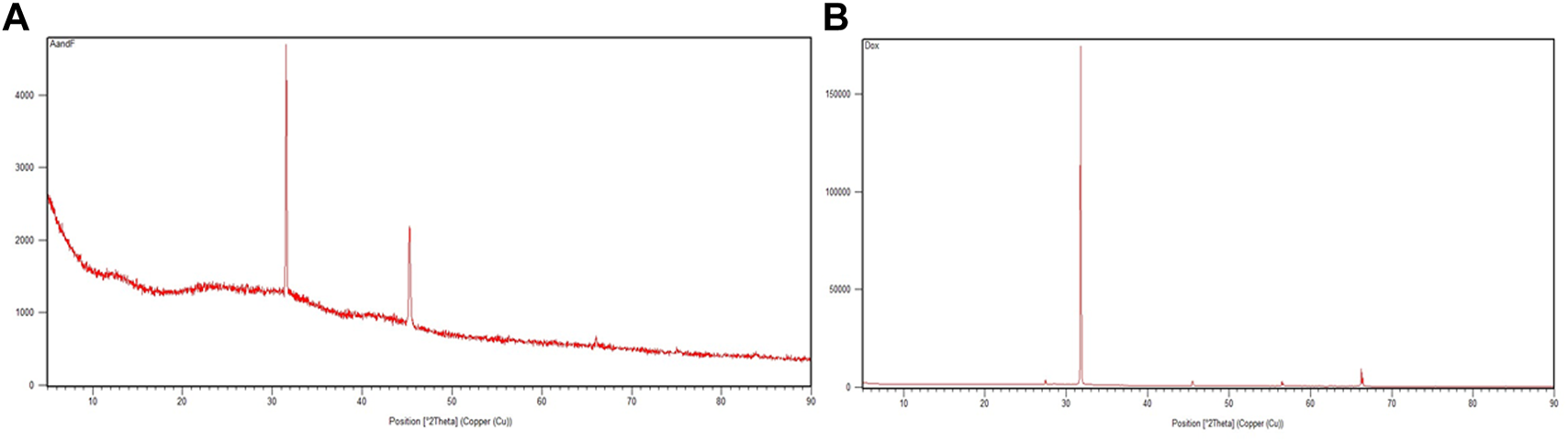 The crystal structures of AuNP-PHF and AuNP-Dox were examined by XRD (Figure 5). AuNP-PHF showed two intense peaks at 28.20 and 31.50. While AuNP-Dox showed one intense peak at 31.70 and 7 short peaks at 27.40, 28.50, 45.40, 56.50, 56.60, 66.20, and 66.40 respectively, confirming the polycrystalline face-centered cubic structure of the synthesized AuNP-PHF and AuNP-Dox.