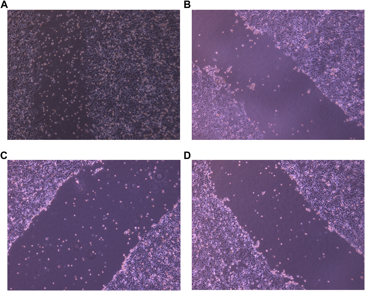 Representative pictures of wound healing ability of PacR/MCF-7 cell lines. Briefly, a wound was created using a scrapper in 35 mm Petri plate with 90%–100% confluent cells. The cells were then exposed to PHF ((B)), AuNP-PHF in combination with AuNP-Dox (6 (C)), and Dox (6 (D)) for 24 h. Untreated cells were chosen as control (6 (A)). As depicted in the figure, the scratch was almost closed in control cells while a consistent breadth of scratch was observed in drug-treated cells suggesting that the chosen drugs potentially inhibited the metastasis ability of PacR/MCF-7 cells.