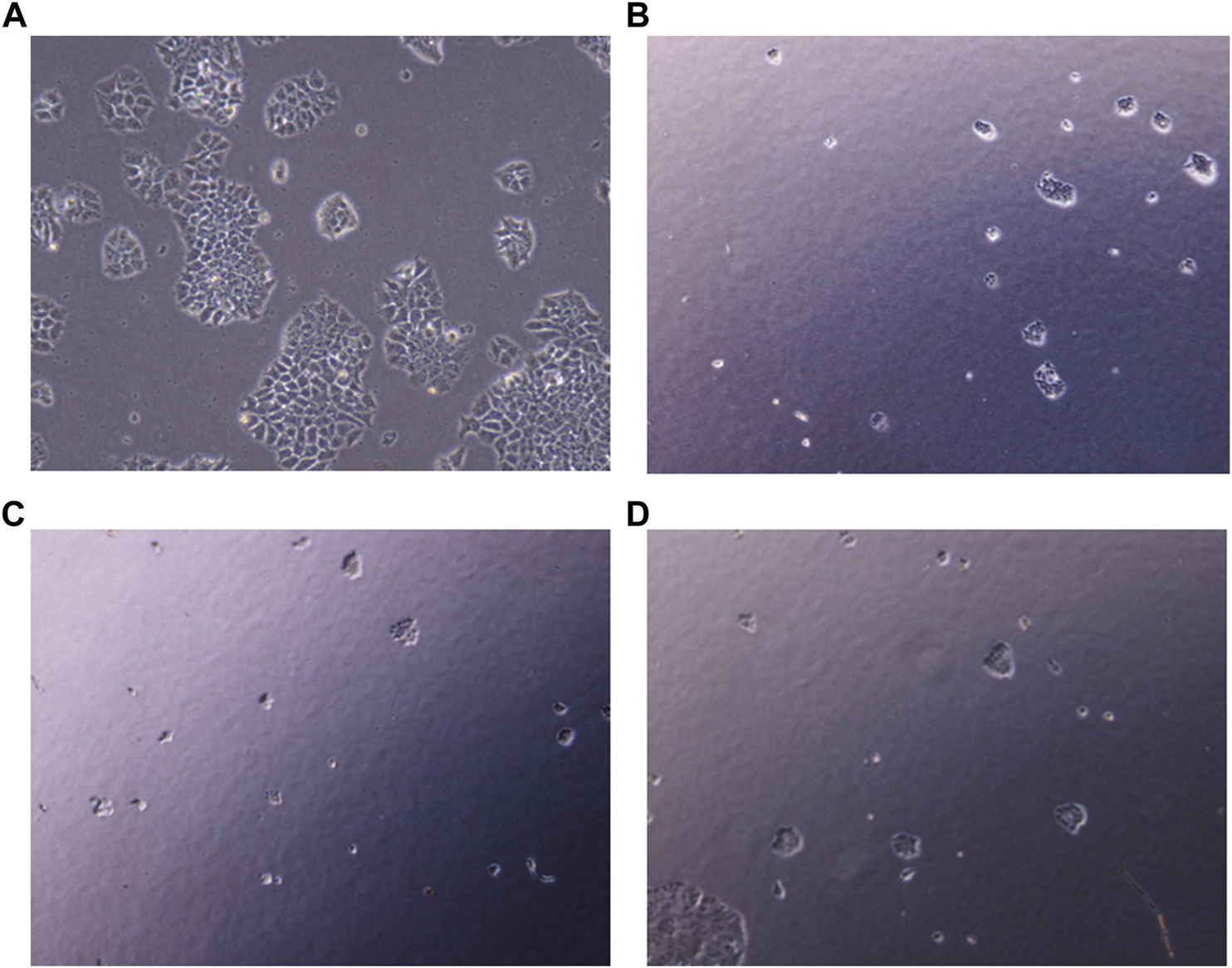 Representative pictures of clonogenic ability of PacR/MCF-7 cell lines. Briefly, single cells were plated on 35 mm Petri plates and incubated for 24 h. Once the cells were adhered, they were exposed to PHF (7 (B)), AuNP-PHF in combination with AuNP-Dox (7 (C)), and Dox (7 (D)) for 24 h. Untreated cells were chosen as control (7 (A)). After incubation, the cells were visualised and the number of colonies formed were recorded. As depicted in the figure, all the drug combinations potentially halted colony formation thereby reduced the tumor-initiating capability.