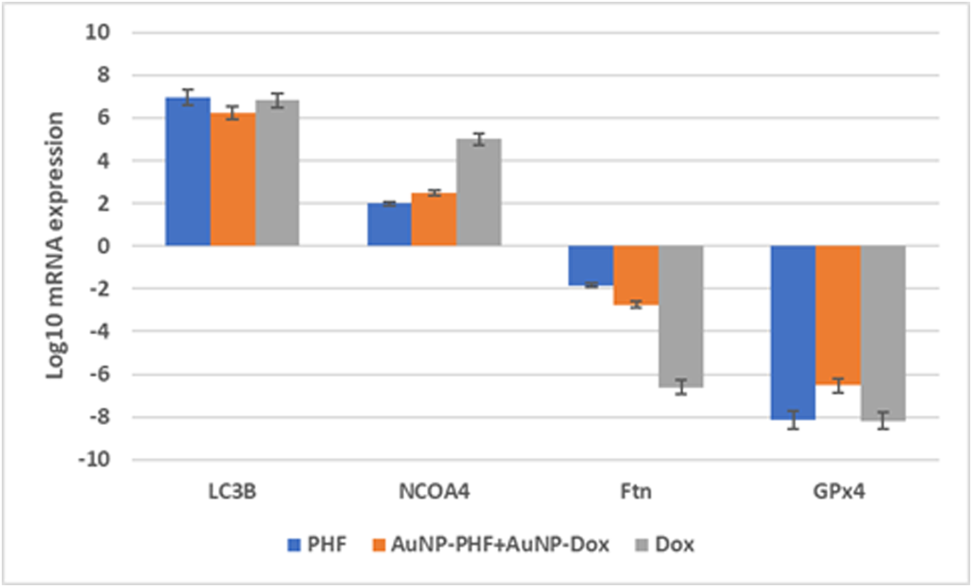 After exposing PacR/MCF-7to the chosen drug combinations (IC50 AuNP-PHF, IC25 AuNP-Dox, IC50 PHF, and IC25 Dox, IC50 Dox), RT-PCR was carried out to analyze the expression of ferritinophagy markers. RT-PCR analysis suggested that the negative regulators of ferritinophagy, i.e., ferritin and GPx4, were downregulated while NCOA4 and LCIIIB, regarded as positive modulators of ferritinophagy, have been upregulated (Figure 8).