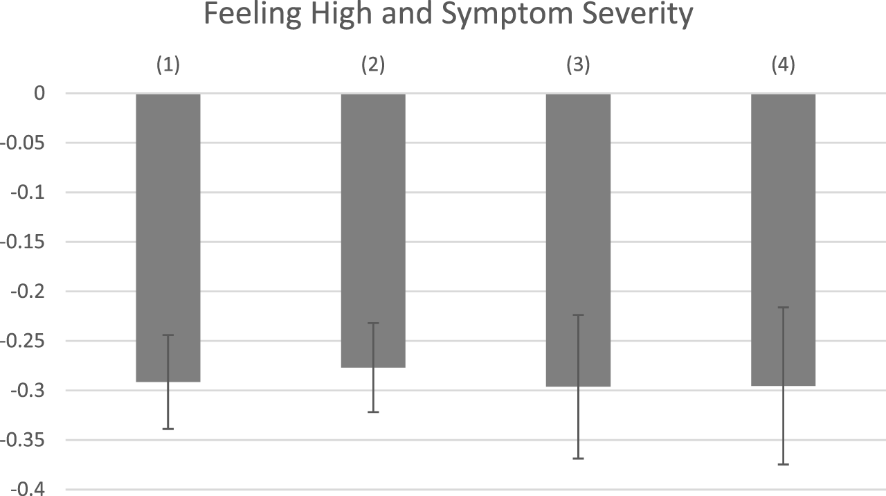 Results: Patients reported feeling high in 49% of cannabis treatment sessions. Using individual patient-level fixed effects regression models and controlling for plant phenotype, consumption mode, tetrahydrocannabinol (THC) and cannabidiol (CBD) potencies, dose, and starting symptom level, our results show that, as compared to sessions in which individuals did not report feeling high, reporting feeling high was associated with a 7.7% decrease in symptom severity from a mean reduction of −3.82 on a 0 to 10 analog scale (coefficient = −0.295, p < 0.001) with evidence of a 14.4 percentage point increase (p < 0.001) in negative side effect reporting and a 4.4 percentage point (p < 0.01) increase in positive side effect reporting. Tetrahydrocannabinol (THC) levels and dose were the strongest statistical predictors of reporting feeling high, while the use of a vaporizer was the strongest inhibitor of feeling high. In symptom-specific models, the association between feeling high and symptom relief remained for people treating pain (p < 0.001), anxiety (p < 0.001), depression (p < 0.01) and fatigue (p < 0.01), but was insignificant, though still negative, for people treating insomnia. Although gender and pre-app cannabis experience did not appear to affect the relationship between high and symptom relief, the relationship was larger in magnitude and more statistically significant among patients aged 40 or less.