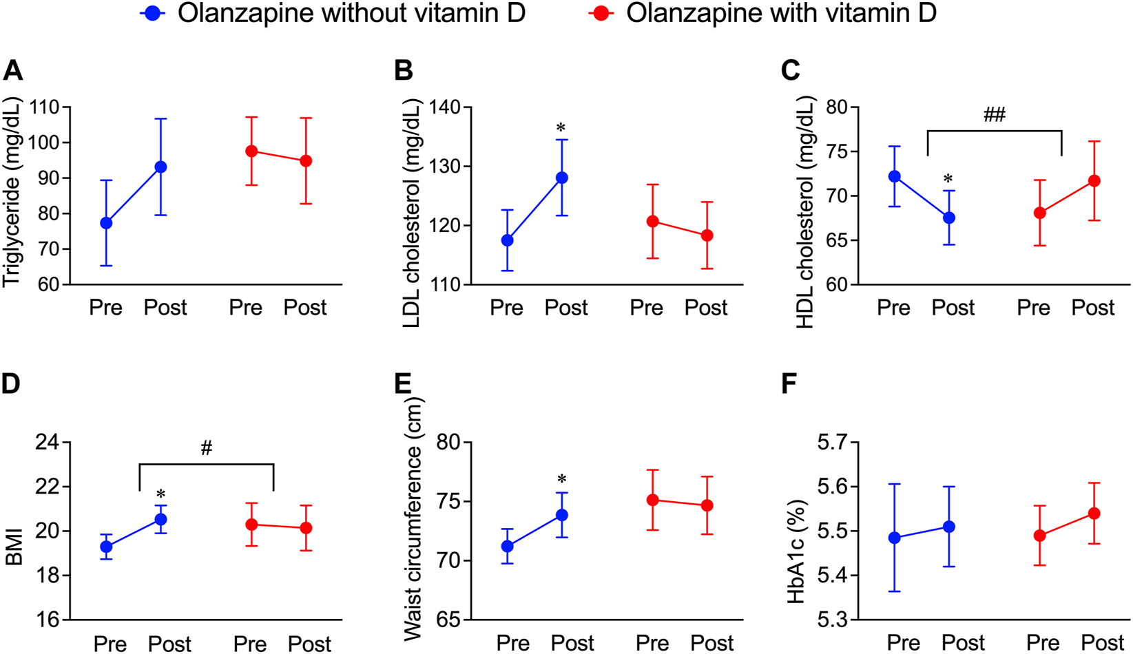Deteriorative effects of olanzapine on blood lipid profiles and body weight maintenance and the rescuing effects of vitamin D co-treatment from the JMDC insurance claims. The data of pre-prescription and post-prescription periods were collected from the nearest test data before or after the olanzapine prescription within 1 year. Background characteristics were matched between groups (n = 20) as shown in Table 2. (A–C) The annual blood test results from patients included in JMDC were extracted. (A) Serum concentrations of triglycerides, (B) low-density lipoprotein (LDL) cholesterol, and (C) high-density lipoprotein (HDL) cholesterol were expressed in units of mg/dL. (D,E) The annual body weights, heights, and waist circumferences included in the JMDC were extracted. (D) Body mass index (BMI) is calculated from body weights and heights and (E) waist circumferences were obtained by direct measurement. (F) the level of HbA1c expressed in units of percentage of blood. Data are shown as means ± SEM. *p < 0.05; a paired t-test of the pre-prescription period against the post-prescription period. #p < 0.05, ##p < 0.01; an unpaired two-tailed t-test with Welch’s correction between the group with and without vitamin D supplementation.