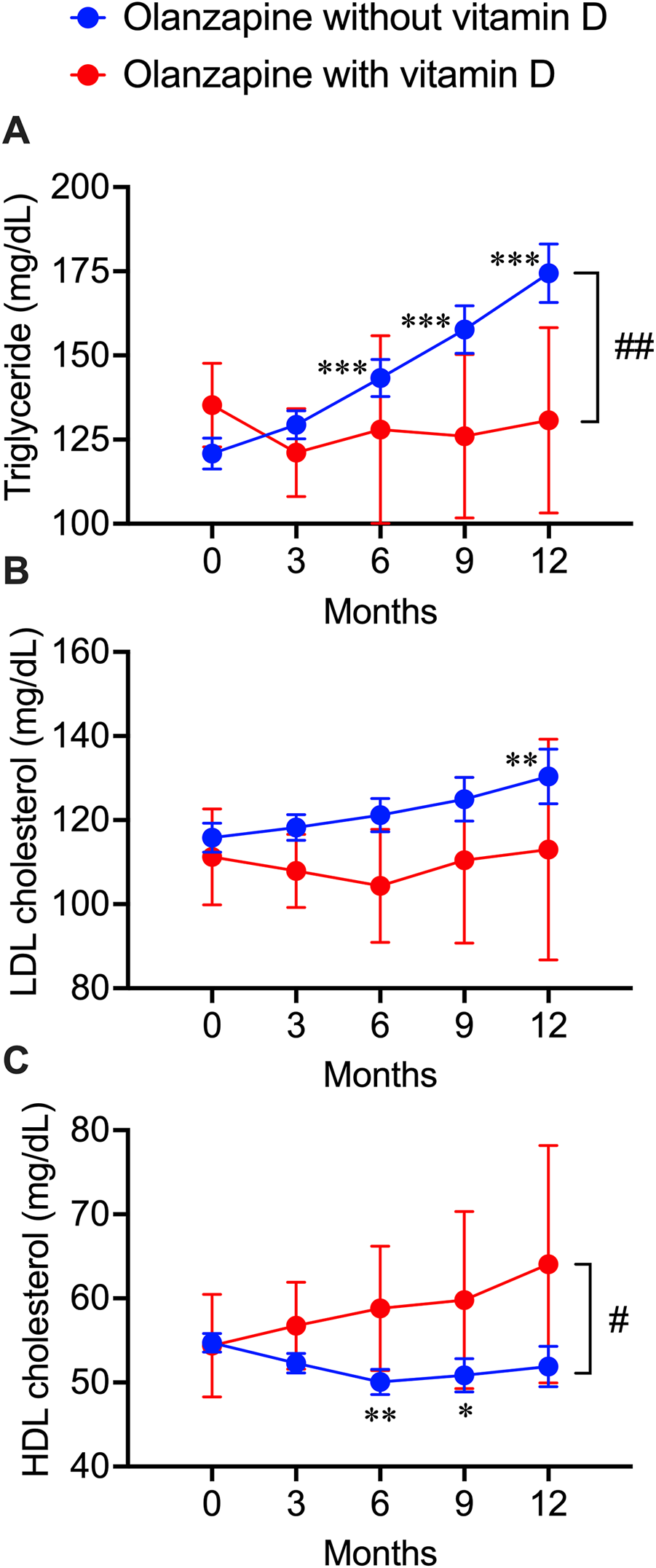 Deteriorative effects of olanzapine on blood lipid profiles and the rescuing effects of vitamin D co-treatment from electronic health records of the clinical data warehouse of Nihon University School of Medicine. Blood test results were extracted every 3 months after the first prescription of olanzapine. (A) the triglycerides (n = 406 in olanzapine without vitamin D group; n = 23 in olanzapine with vitamin D group), (B) the LDL cholesterol levels (n = 154 in olanzapine without vitamin D group; n = 11 in olanzapine with vitamin D group), and (C) the HDL cholesterol levels (n = 258 in olanzapine without vitamin D group; n = 16 in olanzapine with vitamin D group) were expressed in units of mg/dL. Data are shown as means ± SEM. *p < 0.05, **p < 0.01, ***p < 0.001; a paired t-test of data on any months after the olanzapine prescription against the data on month 0 (baseline). #p < 0.05, ##p < 0.01; an unpaired two-tailed t-test with Welch’s correction between the groups with and without vitamin D supplementation.