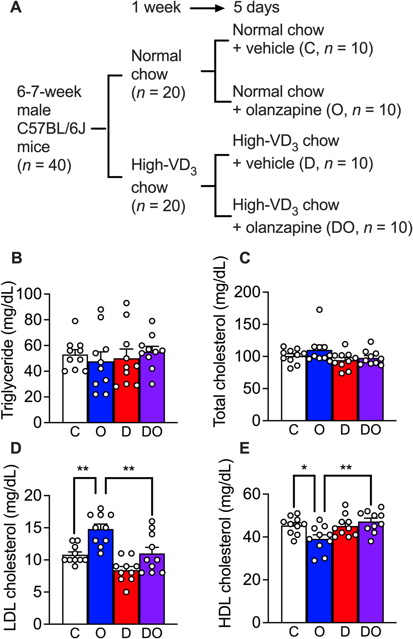 Olanzapine treatment caused dyslipidemia in a rodent model while vitamin D3 supplements attenuated the worsening of the condition. (A) C57BL/6J mice were fed for 1 week with the medium-fat diet (containing 1.37 IU of cholecalciferol/g of chow) or cholecalciferol-supplemented medium-fat diet (containing 200 IU of cholecalciferol/g of chow). Each group of mice were divided into two groups and orally given 10 mg/kg/day of olanzapine or vehicle for 5 days; resulting 4 groups of mice (each n = 10) received normal chow and vehicle as control (C), normal chow and olanzapine (O), vitamin D3-supplemented chow and vehicle (D), and vitamin D3-supplemented chow and olanzapine (DO). Blood samples were collected from these mice 1 day after the last dose of olanzapine without fasting. (B) the triglycerides, (C) total cholesterol levels, (D) LDL cholesterol levels, and (E) HDL cholesterol levels were measured. Data are shown as means ± SEM. The multiple comparisons of olanzapine and cholecalciferol influences were compared by two-way analysis of variance (ANOVA) with post hoc Tukey’s multiple comparison test. *p < 0.05, **p < 0.01.