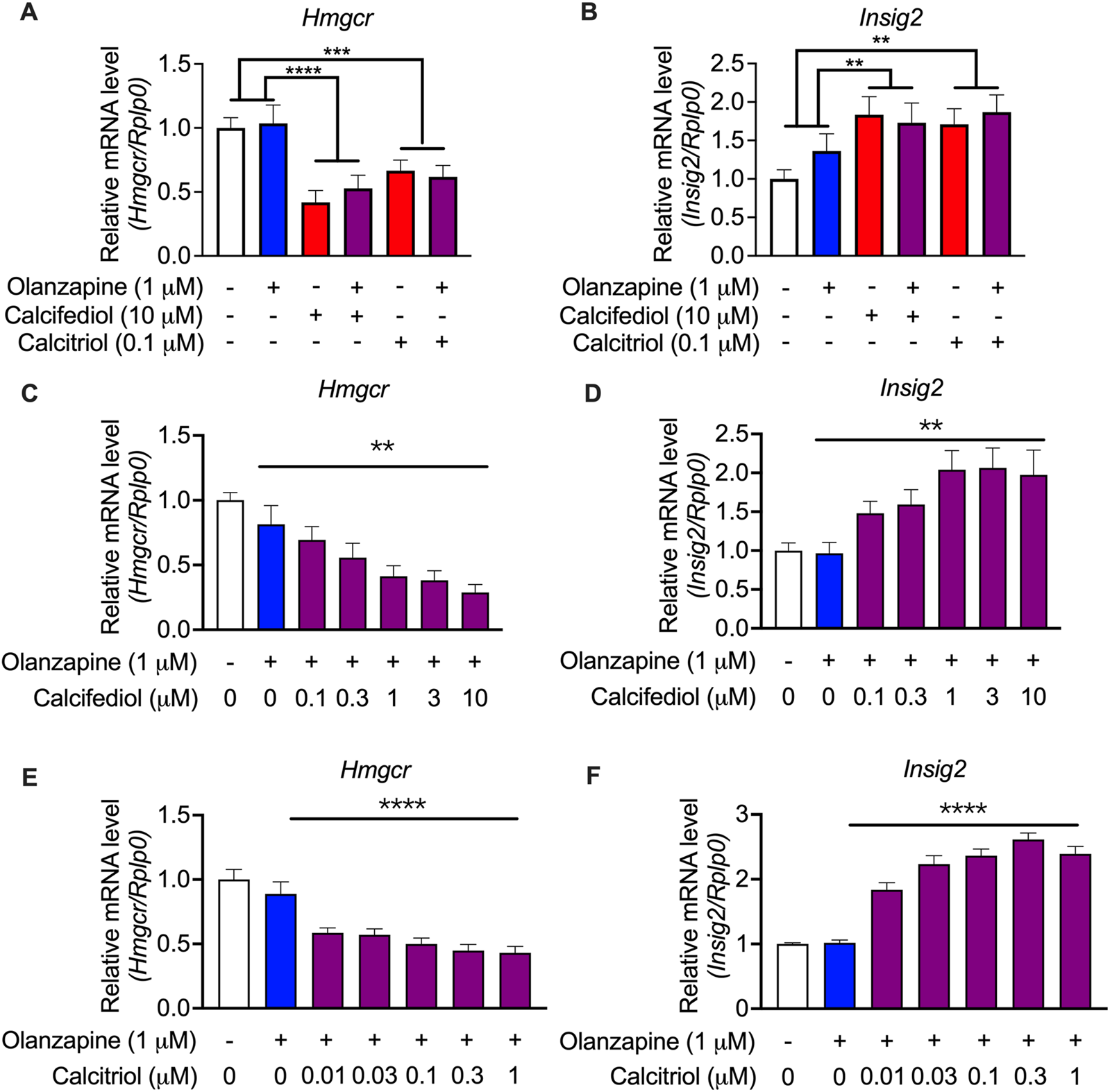 Validation by quantitative RT-PCR results showing the expression of cholesterol biosynthesis-associated genes in the cultured C2C12 cell line. (A) 3-hydroxy-3-methylglutaryl-CoA reductase (Hmgcr) and (B) Insulin-induced gene 2 (Insig2) were validated in the same treating condition as that in the RNA-seq experiments (n = 12). Results were normalized to ribosomal protein, large, P0 (Rplp0). (C)Hmgcr and (D)Insig2 were validated in calcifediol with gradient-changed concentrations increasing from 0 to 10 μM (n = 8–9). (E)Hmgcr and (F)Insig2 were validated in calcitriol with gradient-changed concentrations increasing from 0.01 μM to 1 μM. Data are shown as means ± SEM (n = 9). **p < 0.01, ****p < 0.0001. The comparisons of olanzapine and vitamin D influences were compared by two-way analysis of variance (ANOVA). The validation of the dose-dependent effects of calcifediol and calcitriol were compared by one-way ANOVA.