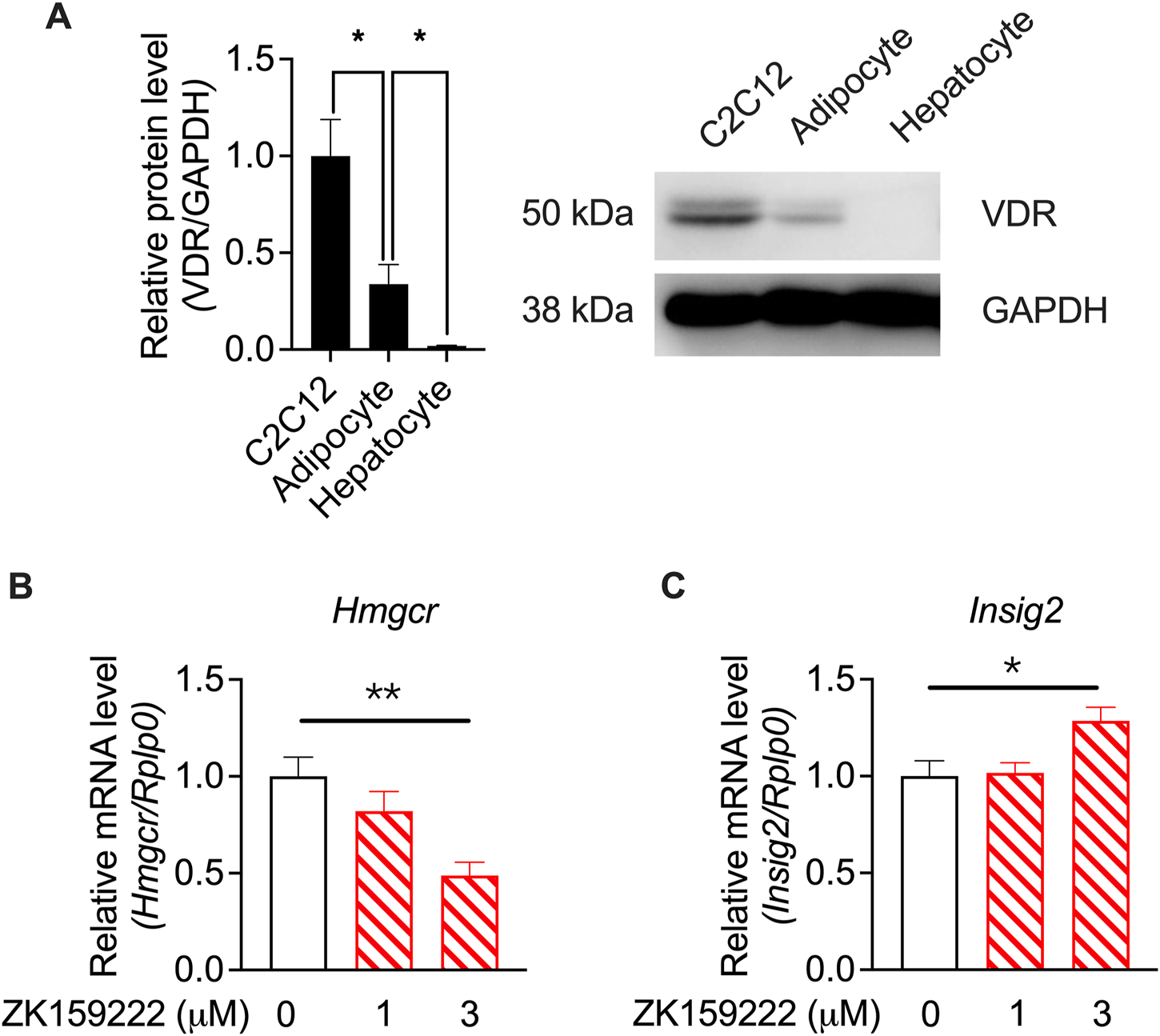 To validate these findings from the RNA-seq analysis, an enlarged batch of evaluations was performed on C2C12 cells, which displayed the highest sensitivity to vitamin D metabolites, using qRT-PCR. Hmgcr was selected as a representative gene for cholesterol biosynthesis because it is the most representative gene involved in the process of cholesterol biosynthesis (Horton et al., 2003). The qRT-PCR results revealed that both the suppression of Hmgcr expression (Figure 6A) and the induction of the expression of Insig2 (Figure 6B) by calcifediol and calcitriol were significant. A previous report claimed that calcifediol, but not calcitriol, independently reduced cholesterol biosynthesis without VDR actions (Asano et al., 2017). However, further validations by changing the concentration of either calcifediol or calcitriol in the treatment medium showed that the expression of Hmgcr (Figure 6C) and Insig2 (Figure 6D) changed in a dose-dependent manner under calcifediol treatment. In parallel, the changes in the expression of Hmgcr (Figure 6E) and Insig2 (Figure 6F) also displayed a dose-dependent effect in calcitriol treatment, with approximately 5.8 times higher sensitivity (IC50 of calcifediol on Hmgcr: 0.68 µM; IC50 of calcitriol on Hmgcr: 0.12 µM). Since calcitriol is the bioactive form of vitamin D, which acts only through VDR, the role of VDR in cholesterol synthesis suppression in this model should not be underestimated and requires further investigation.