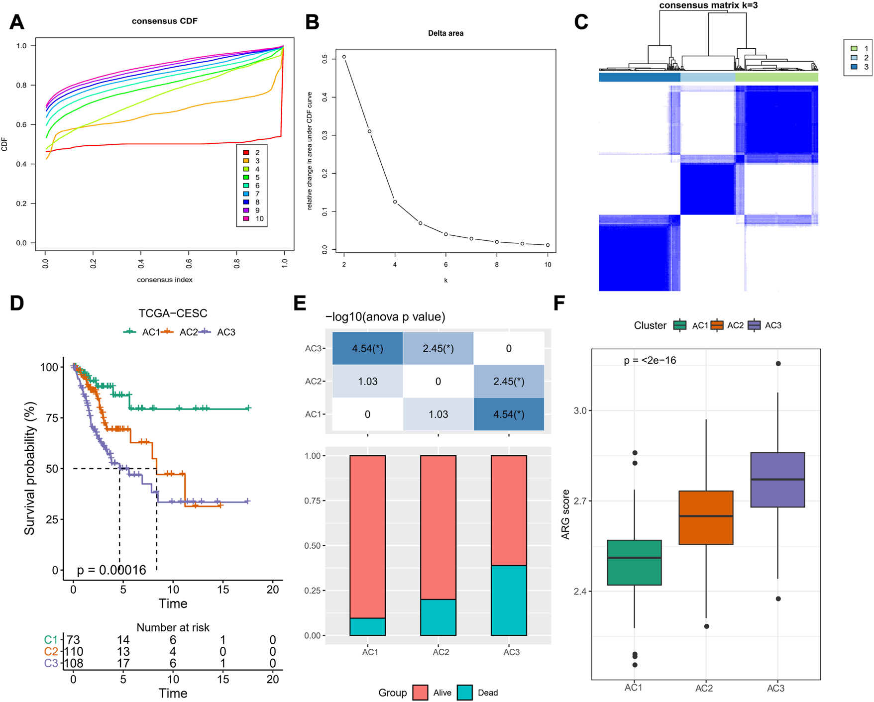 ARLs-related molecular subtypes in TCGA-CESC. (A) Cumulative distribution function (CDF) of consensus clustering (B) CDF Delta area curve for k = 2–10 (C) Heatmap of sample clusters shows consensus matrix k=3 (D) K-M curves of AC1-3 patients in TCGA-CESC (E) Statistical graph of patient survival status for patients in AC1-3 (F) Distribution of ARG score amongst clusters AC1-3. *p < 0.05.