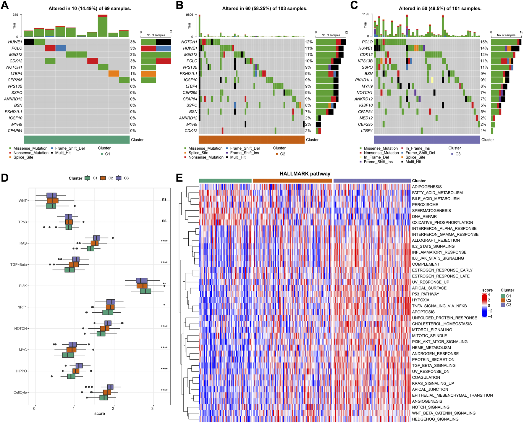 Genetic Landscapes and Biological Pathways in AC1-3 subtypes (A–C) The mutation frequencies of top 15 genes in clusters AC1-3 (D) Distribution of tumorigenesis-related pathways score in AC1-3 (E) Heatmap shows pathway characteristic based on GSVA results. Red represents ssGSEA score is greater than 0 while blue represents ssGSEA score is lower than 0. ns p > 0.05; *p < 0.05; **p < 0.01; *** p < 0.001; ****p < 0.0001.