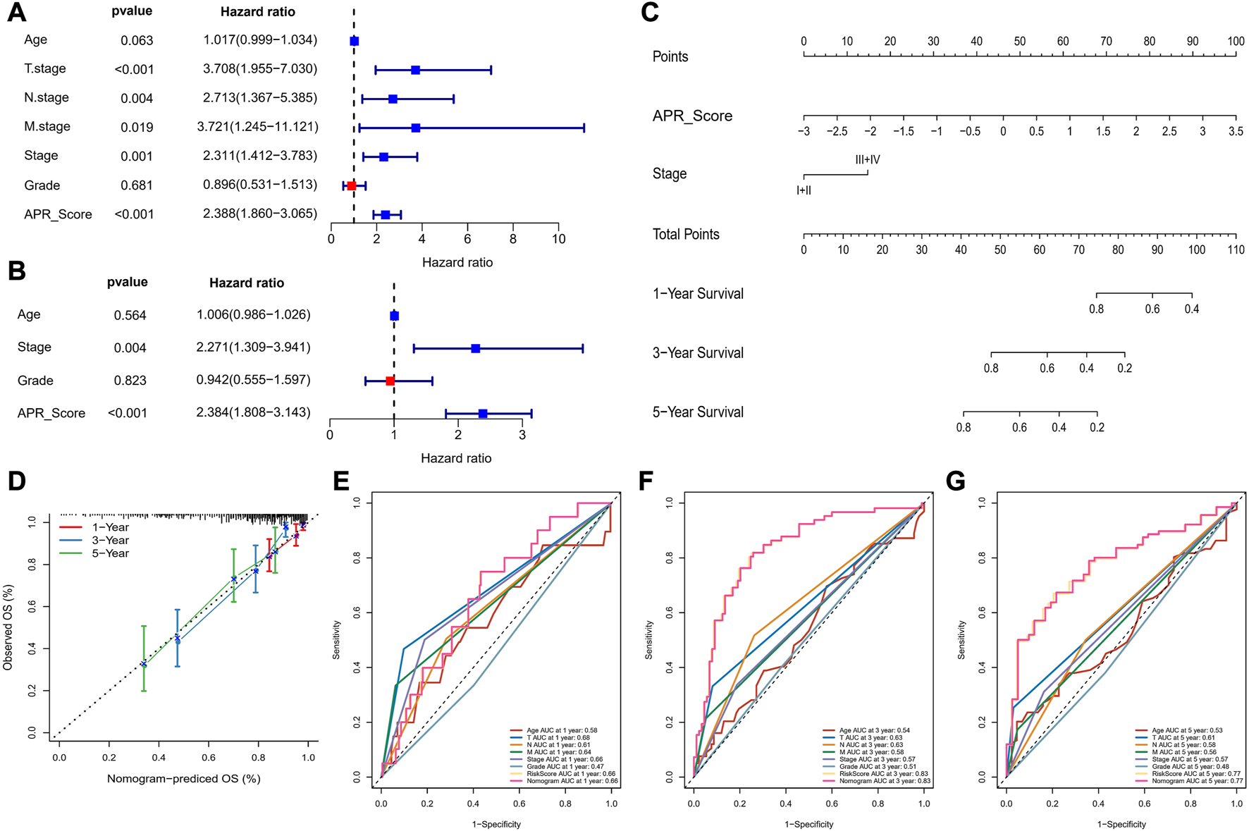 In this study, we constructed a nomogram for predicting 1-year, 3-year and 5-year survival rates of patients using the APR_Score (rms.pdf), and calibration curves were applied to evaluate the predictive accuracy of the nomogram. Finally, the ROC curves were exploited to validate the clinical use of APR_Score and nomogram.