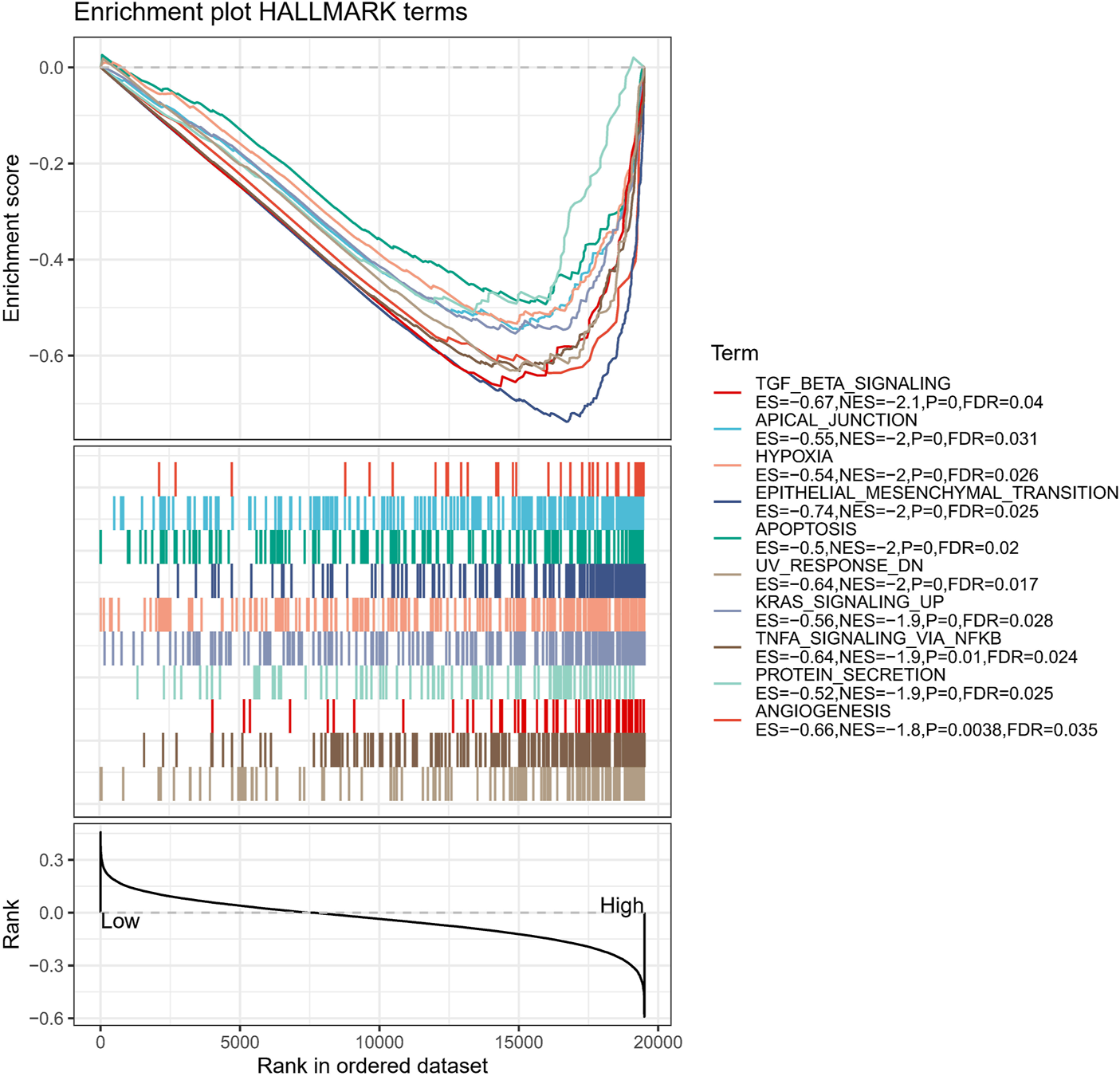For patients in different APR_Score groups, GSEA was performed to explore differences in the biological pathways involved (p < 0.05, FDR<0.25).