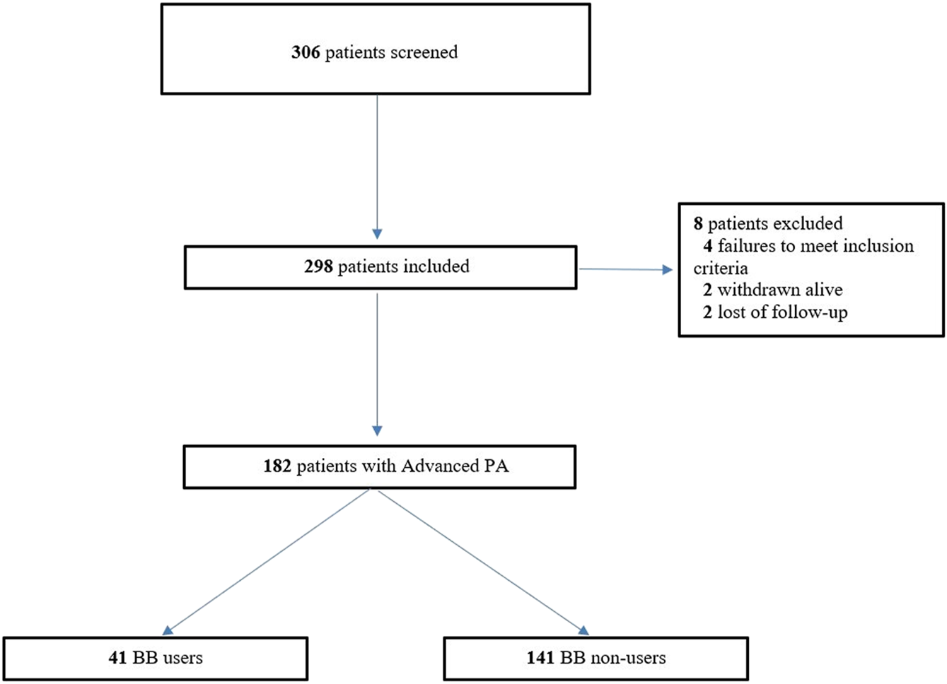 Survival outcomes in patients with advanced PDAC were analyzed and compared between the following groups: BB exposure (BB+), BB non-exposure (BB-), non-selective BB exposure (NSBB+), and selective BB exposure (SBB+). OS was defined as the time from inclusion (administration of first anticancer treatment) to all-cause death or the last follow-up. PFS was defined by progression confirmed from clinical and radiological assessment registered as such in the electronic health record. The primary endpoint was OS in patients with advanced PDAC between BB+ and BB-. The secondary endpoints were PFS for patients with advanced PDAC between BB+ and BB-, and OS and PFS for patients with advanced PDAC (BB+) between NSBB+ and SBB+.