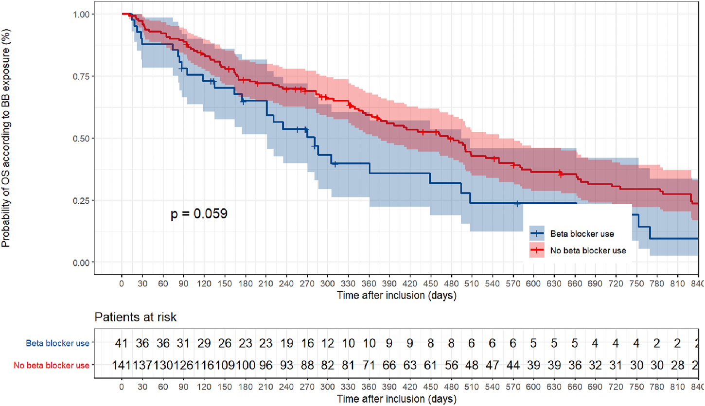 Non parametric Kaplan–Meier estimation of overall survival based on beta-blocker exposure.