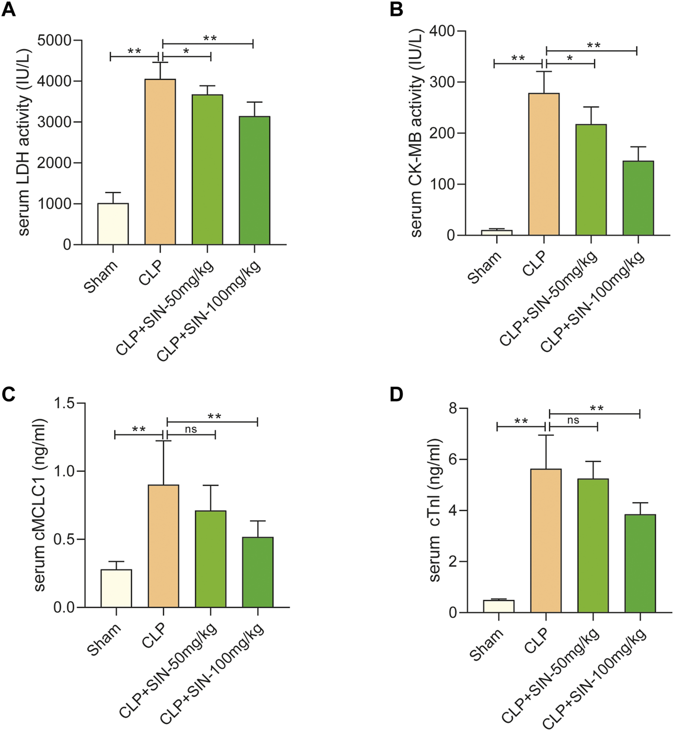 SIN reduced the cardiac dysfunction brought on by CLP. (A) Rat serum LDH response to SIN. (B) Rat serum CK-MB response to SIN. (C) Rat serum cMLC1 response to SIN. (D) Rat serum cTnI response to SIN. n = 6. *p < 0.05, **p < 0.01.