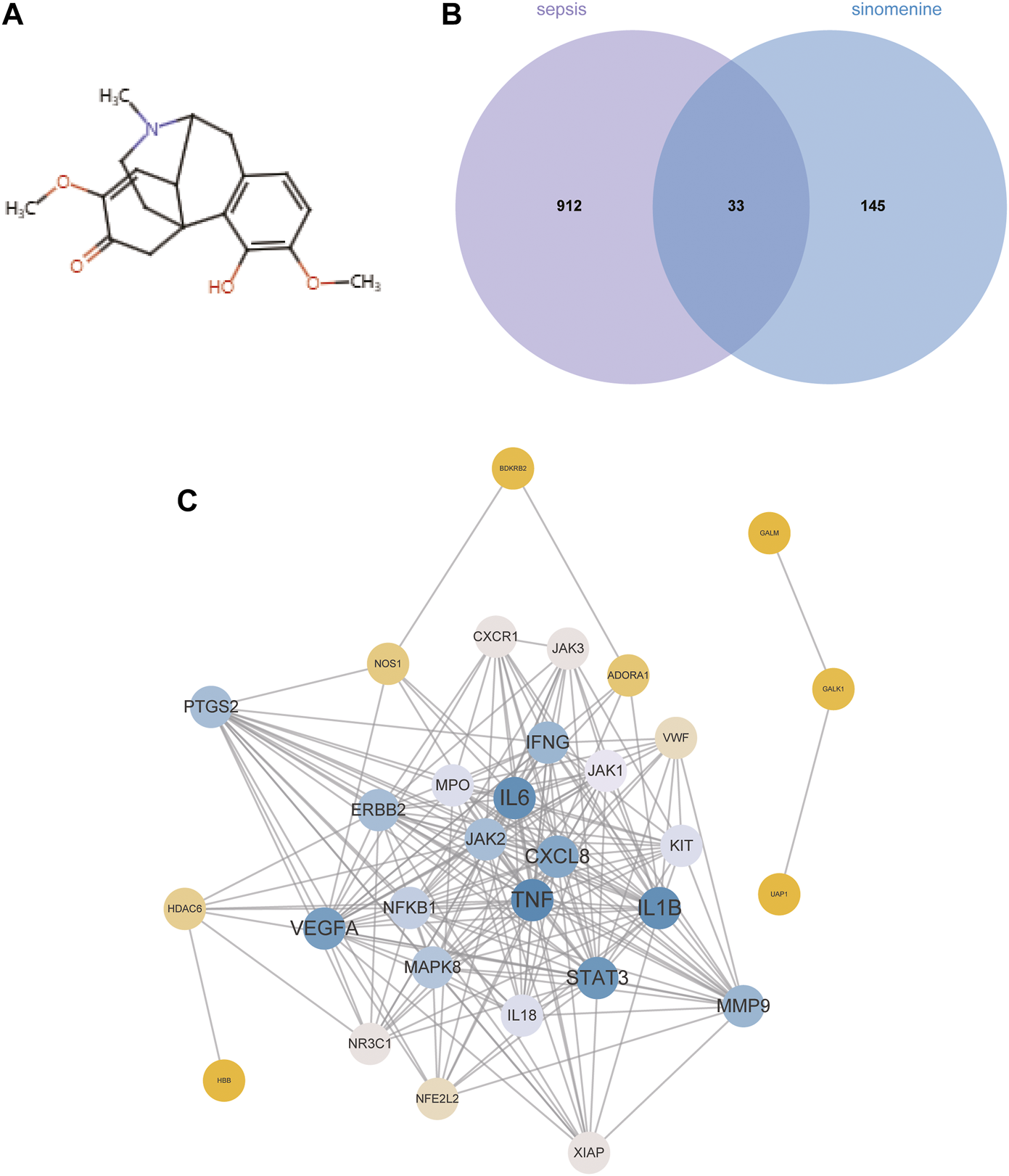 The candidate targets of SIN against sepsis-induced MI. (A) The structure of SIN. (B) Venn diagram of the genes associated with sepsis and SIN targets. (C) The PPI network of the 33 candidate targets was generated by Cytoscape.