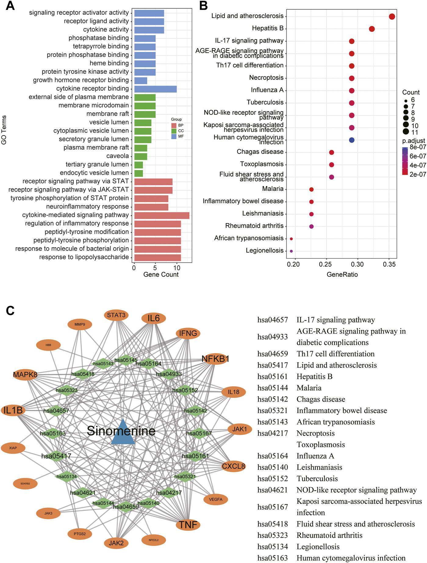 A network pharmacology approach was used to determine the fundamental mechanisms of SIN against sepsis. (A) The top 10 terms of GO analysis of the candidate targets of SIN against sepsis-induced MI. CC: cellular component, BP: biological process, MF: molecular function. (B) The top 20 pathways of KEGG pathway enrichment analysis that ranked by gene count. (C) The SIN-targets-pathway network showed detailed interactions between the hub targets and pathways. Orange cycles stand in for hub targets, while green circles represent the top 20 pathways that SIN uses to combat sepsis.