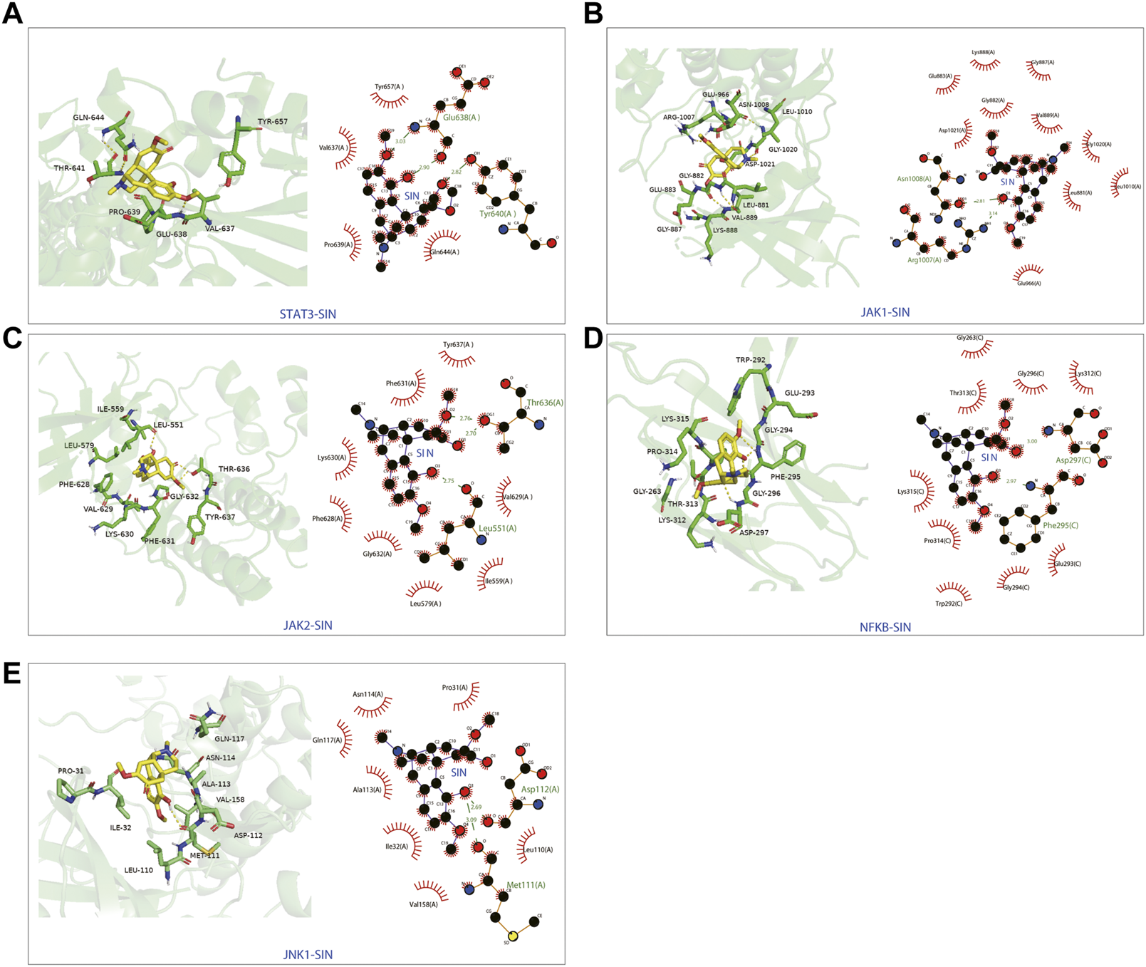 The 3D and 2D diagrams showing the molecular docking pose of SIN with (A) STAT3, (B) JAK1, (C) JAK2, (D) NF-κB, and (E) JNK1.