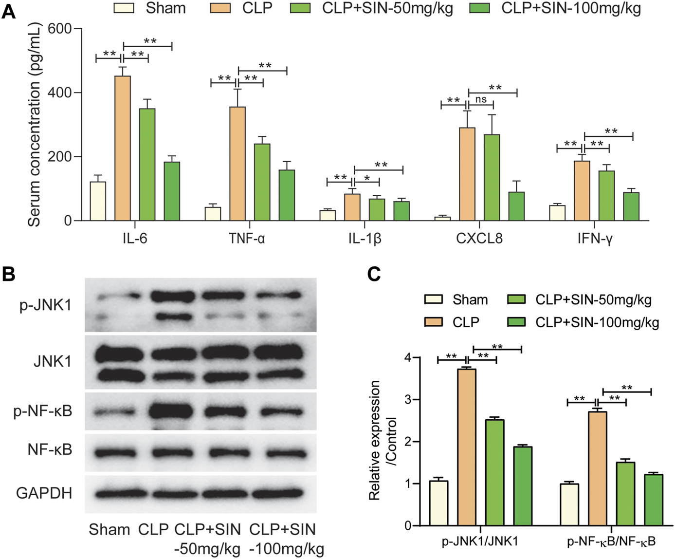 The IL-17 pathway was found to be implicated in the effects of SIN on mitigating sepsis-induced cardiac dysfunction in this study via network pharmacology and KEGG enrichment analysis. The targets of SIN involved in the IL-17 signal pathway, including JNK1, NF-κB, IL-1β, etc., were found and illustrated in Figure 4C. Therefore, the effect of SIN on these targets were detected in vivo. As shown in Figure 6A, SIN demonstrated a significant dose-dependent effect in significantly reversing the increased inflammatory cytokines induced by CLP, including TNF-α, IL-1β, IL-6, IFN-γ, and CXCL8. Based on molecular docking simulations, SIN was found to exhibit binding affinity with JNK1 and NF-κB, and may have potential impacts on the phosphorylation of these targets. The expression levels of p-JNK1 and p-NF-κB were shown to be significantly elevated by CLP, but reduced after treatment with SIN (Figure 6B). Taken together, these findings implied that the IL-17 signal pathway is expected to attenuate the effect of SIN on sepsis-induced MI.
