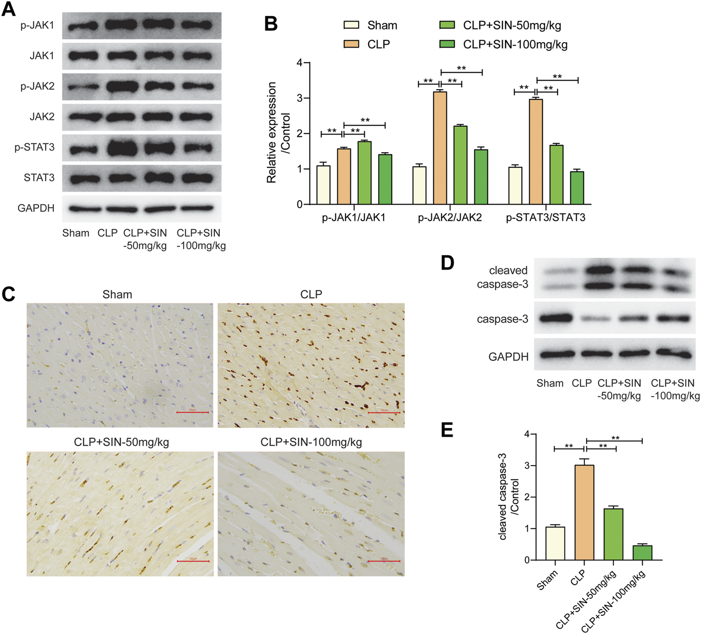 The effects of SIN on the JAK/STAT pathway and cardiomyocyte apoptosis. (A,B) The expression levels of JAK1, JAK2, STAT3, and phosphorylated JAK1, JAK2, and STAT3 were assessed via Western blot. (C) The apoptosis level of cardiomyocytes was detected by TUNEL staining. (D,E) The protein expression of caspase-3 and cleaved-caspase-3 were evaluated. n = 6. *p < 0.05, **p < 0.01.