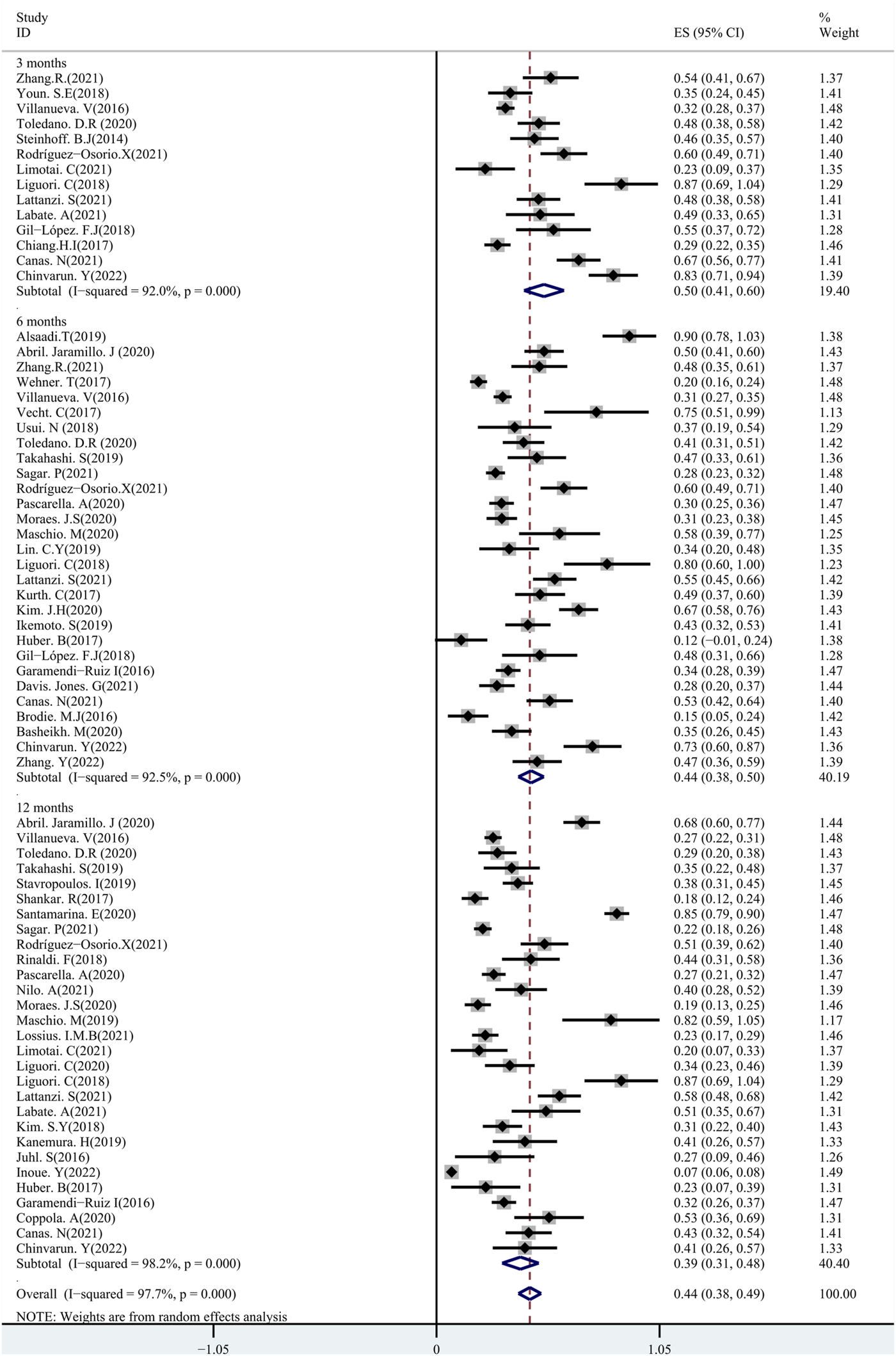 Forty-eight studies reported data on the proportion of patients who continued treatment at the end of the follow-up period. In addition, 32 studies provided long-term retention data. The pooled retention rate was 84.0% (95% CI: 0.76–0.91), 74.0% (95% CI: 0.68–0.80), and 69.0% (95% CI: 0.63–0.75) at 3, 6, and 12 months of PER treatment, respectively (Supplementary Figure S1).