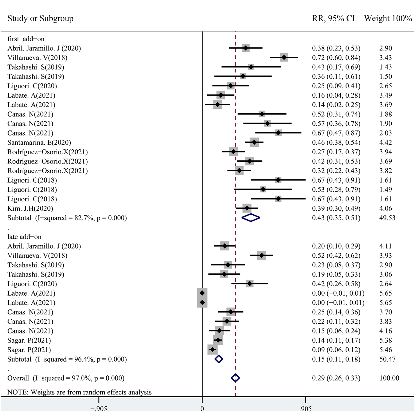 FIGURE 5. First (A) vs. late add-on (B): pooled 50% responder rate by follow-up points (3, 6, and 12 months after PER treatment).