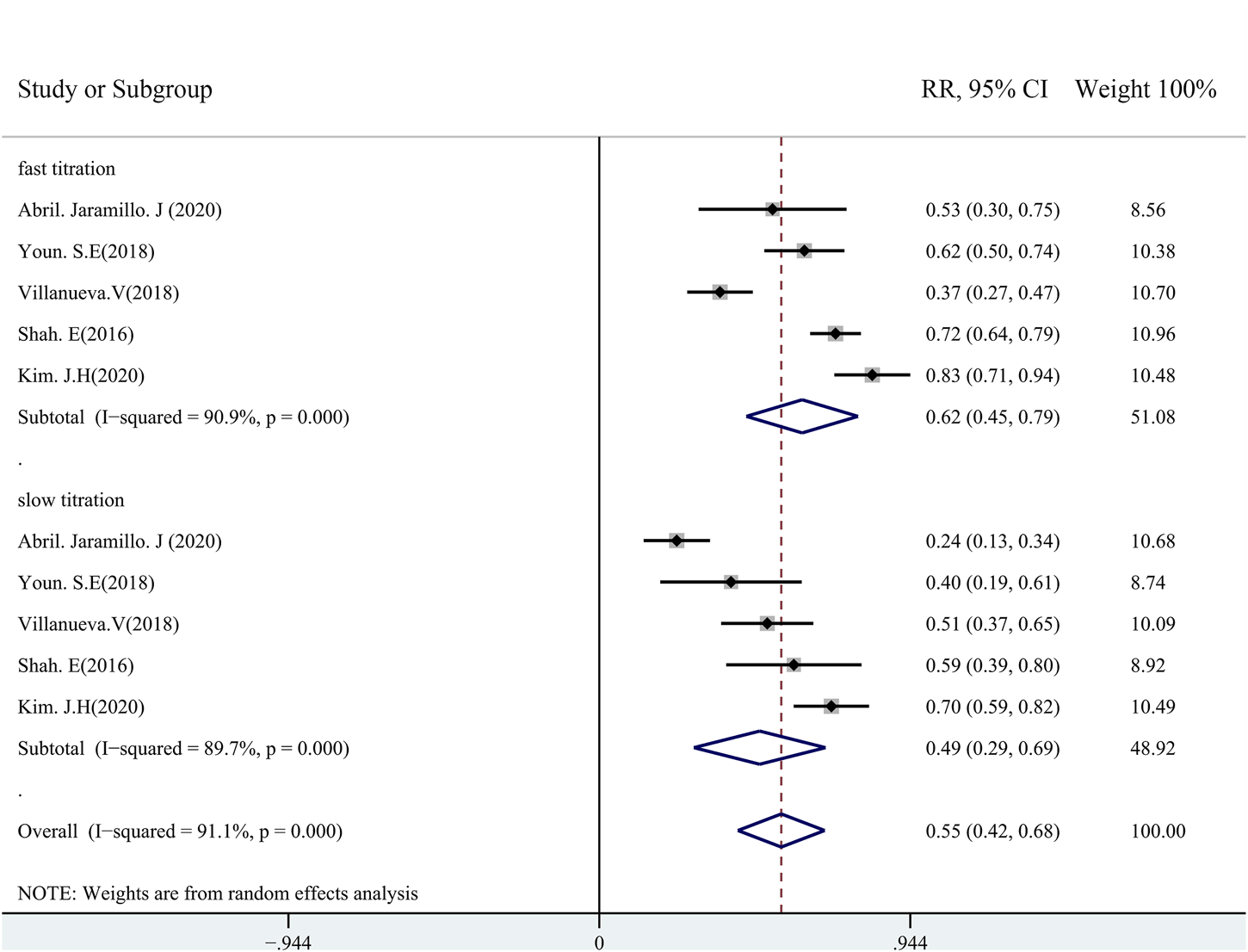 Considering that the efficacy and safety of PER usage could be affected by various factors, the following subgroup analyses (50% responder rate, seizure freedom, AE rate, and retention rate) were performed. Comparisons between the subgroups were based on dose titration (slow titration vs. fast titration), treatment regimen (primary monotherapy vs. conversion monotherapy), interactions of concomitant AEDs (with vs. without EIAEDs), study duration (short-term follow-up of 3 months and 6 months vs. long-term follow-up ≥12 months), and PER add-on therapeutic schedule (first vs. late add-on therapy) were performed.