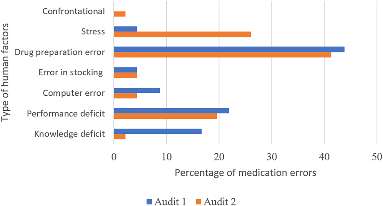 Human factors were responsible for most MEs (95% for A1 and 85.19% for A2). During A2, nurses’ workload was increased as compared to A1, which is recognized as a risk factor for ME increasing (Alomari et al., 2015). However, ME proportion related to human factors was lower for A2. This may illustrate a positive aspect of audit feedback on these MEs.