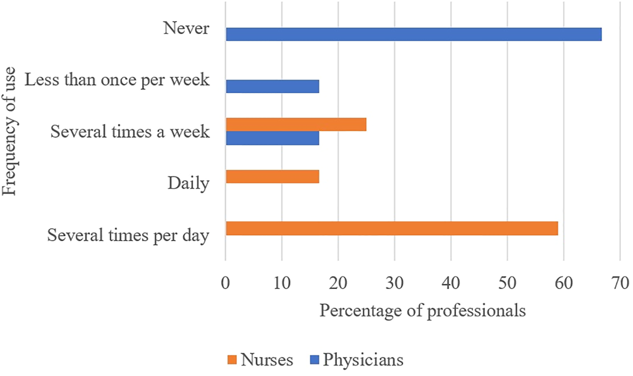 Tools were used more frequently by nurses than physicians, as shown in Figure 3. Majority of doctors had never used tools whereas the nurses used the tools at least several times a week.