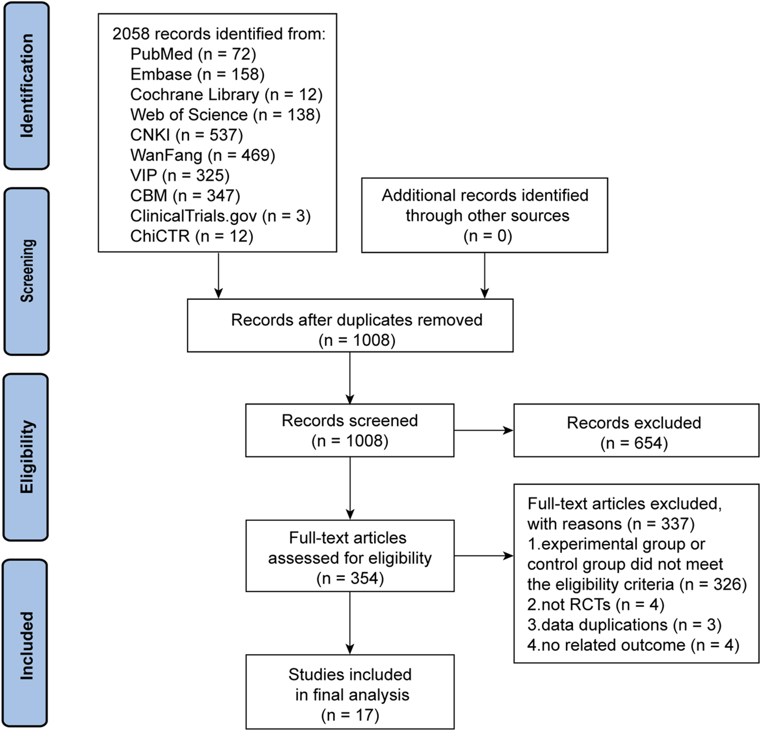The initial search yielded 2,073 articles. After deleting duplicate literature, 1,008 articles were screened for title and abstract. A total of 654 articles were subsequently excluded and 354 articles were then screened in detail. After reading the full text of the remaining 354 articles, 326 trials in the experimental group or control group failed to meet the eligibility criteria. Four trials did not belong to RCTs (Ye, 2019; Li, 2020; Wen and LYU, 2020; Zhao et al., 2022), three trials had duplicate data (Luan, 2012; Pang, 2016; He and Wang, 2019), and another four trials did not include outcomes that met the criteria (Lin, 2012; Mao et al., 2015a; Mao et al., 2015b; Zhou et al., 2016). Ultimately, 17 trials (Du and Wang, 2011; Luan and Pan, 2012; Wu et al., 2015; He, 2016; Li, 2016; Chen et al., 2017; Lin et al., 2017; Du et al., 2018; Luo, 2018; Pang et al., 2019; Tao et al., 2019; Zhang and Jin, 2019; Lian, 2020; Lu et al., 2021; Mao et al., 2021; Zheng et al., 2021; Yu et al., 2022) were deemed qualified for the meta-analysis. The PRISMA flow chart of the trial selection process is shown in Figure 1.