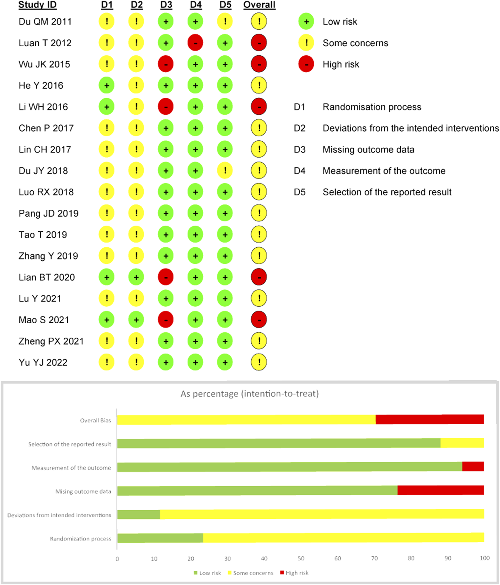 All of the trials mentioned randomization, 12 trials (Wu et al., 2015; He, 2016; Li, 2016; Chen et al., 2017; Lin et al., 2017; Luo, 2018; Tao et al., 2019; Zhang and Jin, 2019; Lian, 2020; Lu et al., 2021; Mao et al., 2021; Yu et al., 2022) mentioned the use of random sequence methods such as random number tables, computer-generated random numbers, or central random systems, and four of them (He, 2016; Li, 2016; Lian, 2020; Mao et al., 2021) also mentioned methods of assigning concealment and were therefore considered “low risk.” For “bias due to deviating from expected interventions,” two trials (Lian, 2020; Mao et al., 2021) were rated “low risk” because they used blinding for subjects, operators, and outcome evaluators. Four trials (Wu et al., 2015; Li, 2016; Lian, 2020; Mao et al., 2021) did not explicitly explain the absence of follow-up, so “bias due to missing outcome data” was rated as “high risk.” One trial (Wu et al., 2015) was rated “high risk” for “bias due to measurement of the outcome” because it did not blind the evaluator, and the remaining studies should be considered “low risk” because of the objectivity of the outcome measures. In addition, the “bias in the selection of the reported result” in two trials (Du and Wang, 2011; Du et al., 2018) was rated as “some concerns” because planned outcomes were not explicitly mentioned in the prespecified protocol, while the remaining trials were assessed as “low risk” because their outcome measurement and analysis were consistent with the prespecified protocol. Based on the assessment of the above five areas, the overall bias of five trials (Luan and Pan, 2012; Wu et al., 2015; Li, 2016; Lian, 2020; Mao et al., 2021) was rated as “high risk of bias,” while the overall bias of other trials was rated as “some concerns.” The specific information of bias risk assessment is shown in Figure 2.