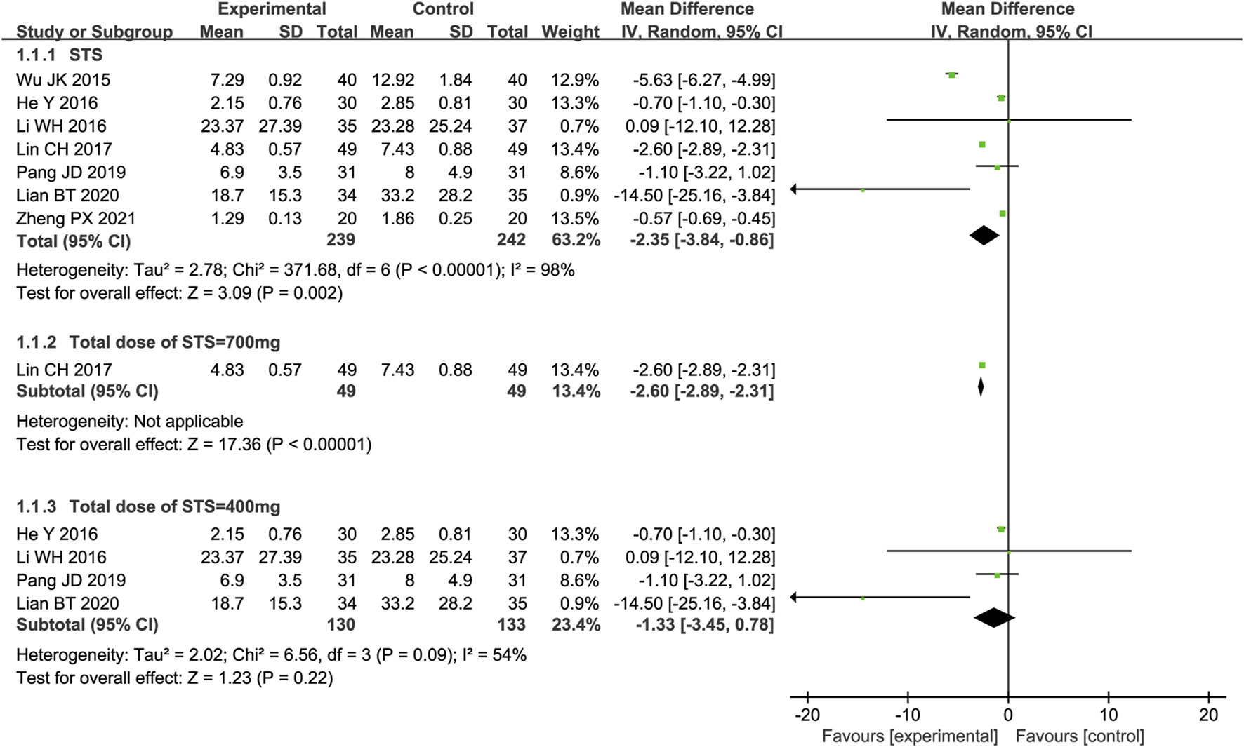 A meta-analysis of seven trials showed that STS significantly reduced hs-CRP levels in patients [MD = −2.35, 95% CI (−3.84, −0.86), p = 0.002]. Due to significant clinical heterogeneity (p < 0.00001, I2 = 98%), meta-regression analysis was performed to identify possible sources of high heterogeneity. Meta-regression analysis determined that heterogeneity was independent of the intervention time point and test method but was related to the total dose of STS (p < 0.05, Supplementary Figure S1). Therefore, a subgroup analysis was performed based on the total dose of STS. The results showed that both a total dose of 700 mg [MD = −2.60, 95%CI (−2.89, −2.31), p < 0.00001] and a total dose of 400 mg [MD = −1.33, 95%CI (−3.45, 0.78), p = 0.22] of STS significantly reduced hs-CRP levels compared with the control group. This reduced considerably heterogeneity between studies (p = 0.09, I2 = 54%). Because the total STS dose was not reported in the two studies, a subgroup analysis for these studies was not possible. The results are shown in Figure 3.