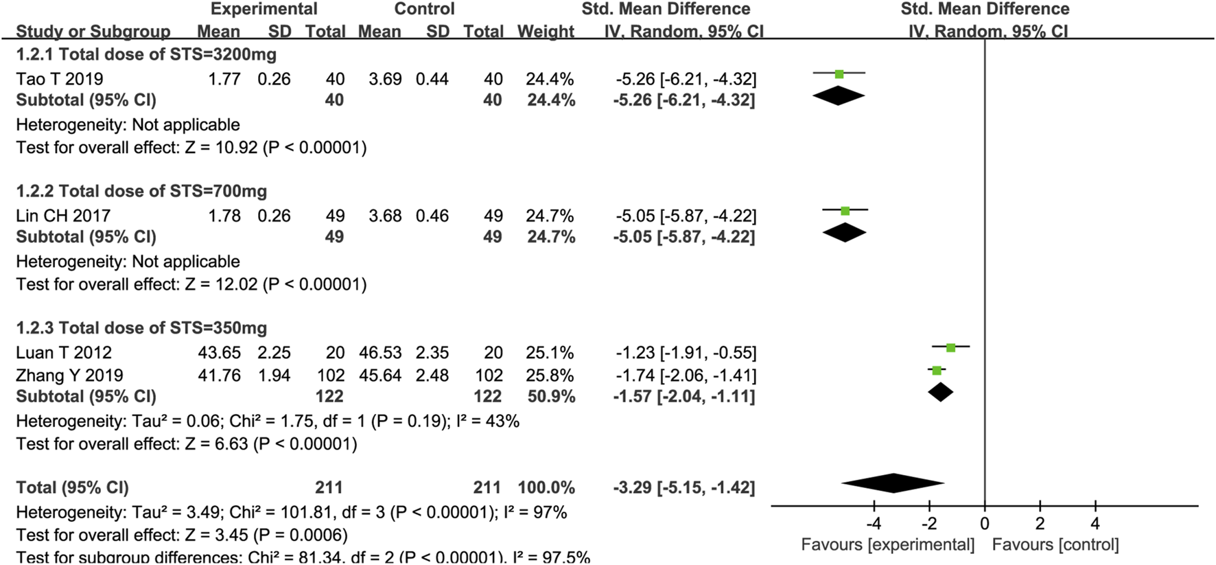Four trials reported on TNF-α, and the meta-analysis results showed that STS significantly reduced TNF-α levels in patients [SMD = −3.29, 95%CI (−5.15, −1.42), p = 0,006]. Among the four trials, the intervention time point of STS and the detection methods of TNF-α were consistent. Meta-regression analysis determined that significant clinical heterogeneity (p < 0.00001, I2 = 97%) was related to the total dose of STS (p < 0.05, Supplementary Figure S2). A subgroup analysis based on the total dose of STS showed that, compared with the control group, different total doses of STS also significantly reduced TNF-α levels (Total dose of STS = 3200 mg: SMD = −5.26, 95%CI (−6.21, −4.32), p < 0.00001; Total dose of STS = 700 mg: SMD = −5.05, 95%CI (−5.87, −4.22), p < 0.00001; Total dose of STS = 400 mg: SMD = −1.57, 95%CI (−2.04, −1.11), p < 0.00001] compared with the control group. The heterogeneity between studies was significantly reduced (p = 0.19, I2 = 43%). The results are presented in Figure 4.