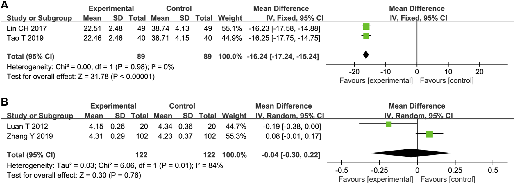 STS effects on LPO were reported in two trials. The heterogeneity between them was insignificant (p = 0.97, I2 = 0%); therefore, a fixed-effects model was adopted. The results showed that STS was superior to the control group in reducing LPO [MD = −2.32, 95%CI (−2.70, −1.93), p < 0.00001], Figure 6B).