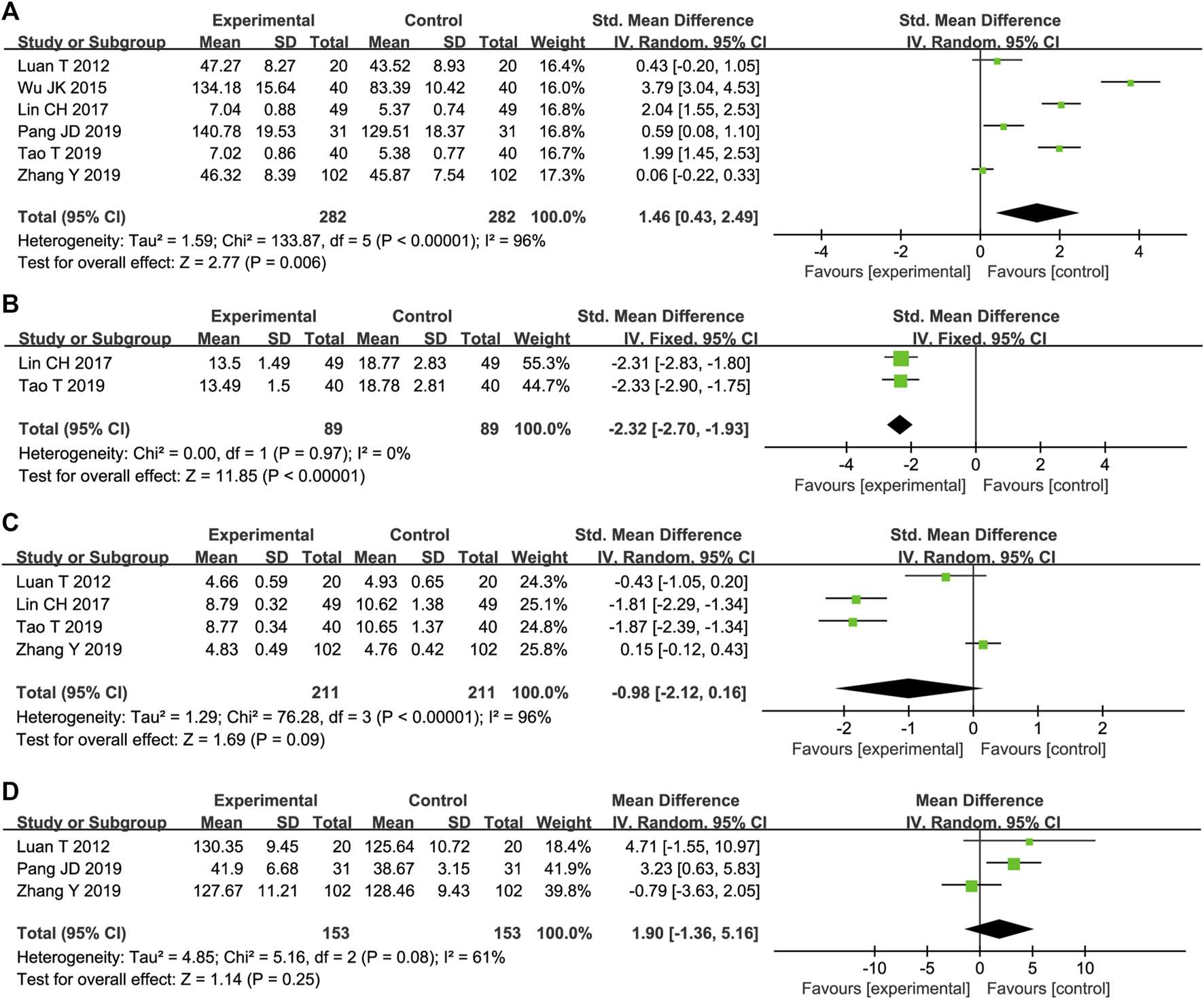 As shown in Figure 6C, MDA levels were reported in four trials. The results of two trials showed that STS was superior to CTs in reducing MDA [SMD = −1.81, 95%CI (−2.29, −1.34), p < 0.00001]; SMD = −1.87, 95%CI (−2.39, −1.34), p < 0.00001]. However, the pooled results of the four trials showed that there was no statistical difference in MDA reduction between the two groups [SMD = −0.98, 95%CI (−2.12, 0.16), p < 0.00001].