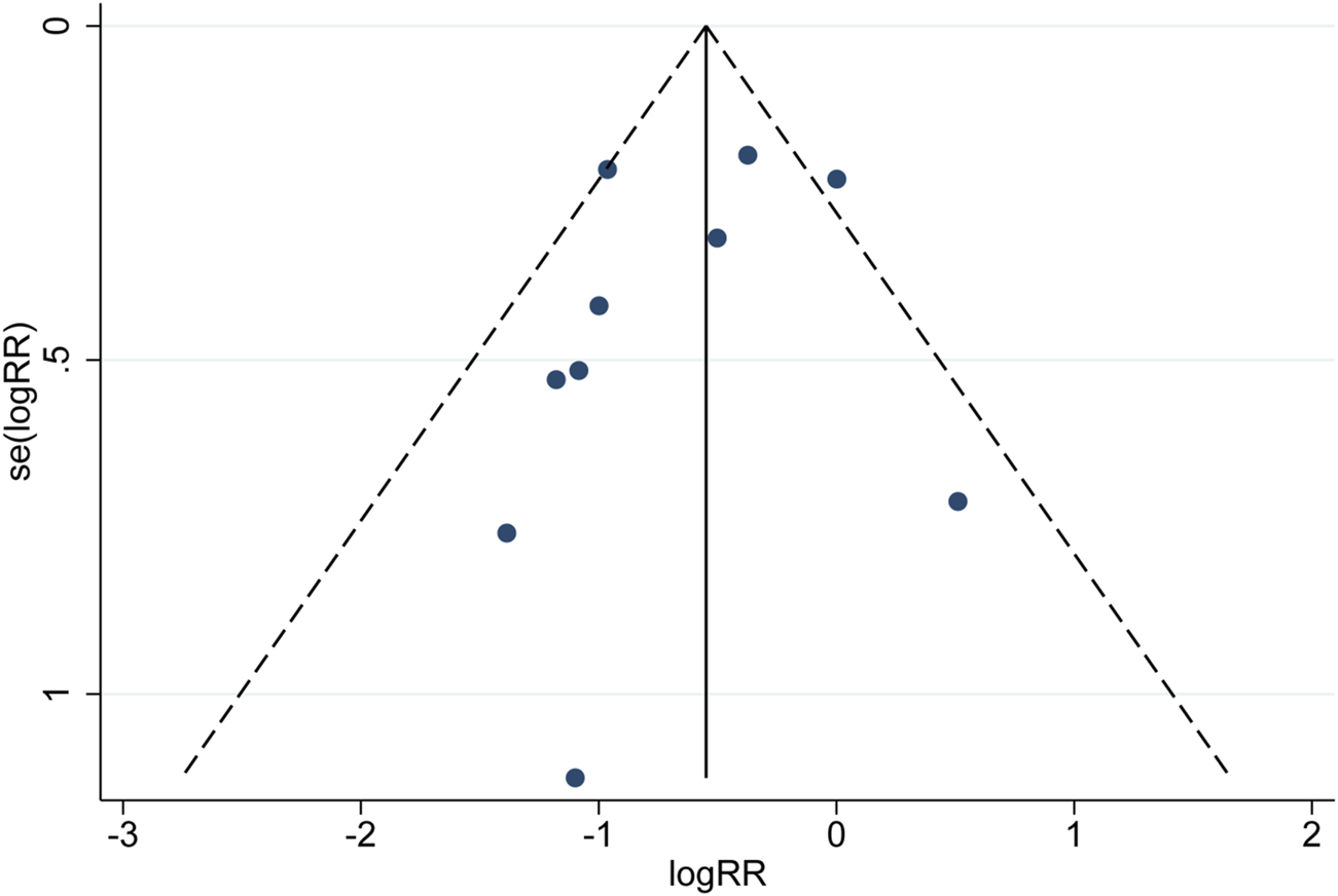 Ten trials reported AEs, four of which reported no adverse reactions in either group, while the remaining studies reported adverse reactions in both groups. As shown in Figure 8, there was little heterogeneity among the studies (p = 0.51, I2 = 0%); therefore, the fixed-effect model was adopted. Meta-analysis showed no significant difference in adverse events between the two groups (RR = 0.76, 95%CI [0.38, 1.55], p = 0.46).