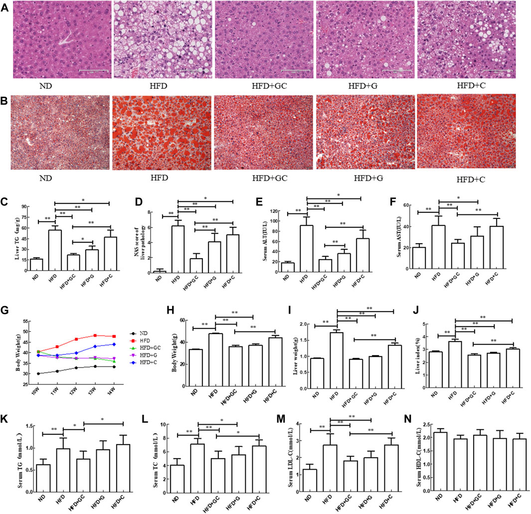 Figure 1. Changes in liver histology as well as biochemical indexes of liver and serum in a mouse NAFLD model with intervention of geniposide, chlorogenic acid, or their combination. (A) H&E staining, ×200. (B) Oil red O staining, ×200. (C) Liver TG level. (D) Liver NAS. (E) Serum ALT level. (F) Serum AST level. (G) Mouse body weight. (H) Mouse body weight. (I) Mouse wet liver weight. (J) Mouse liver index, wet liver weight/body weight × 100%. (K) Serum TG level. (L) Serum TC level. (M) Serum LDL-C level. (N) Serum HDL-C level. Abbreviations: ND, normal diet; HFD, high-fat diet; GC, geniposide and chlorogenic acid combination treatment; G, geniposide treatment; C, chlorogenic acid treatment; TG, triglyceride; ALT, alanine aminotransferase; AST, serum aspartate aminotransferase; NAFLD, non-alcoholic fatty liver disease; H&E, hematoxylin and eosin; NAS, NAFLD activity score. *p < 0.05 and **p < 0.01 (n = 10 per group).