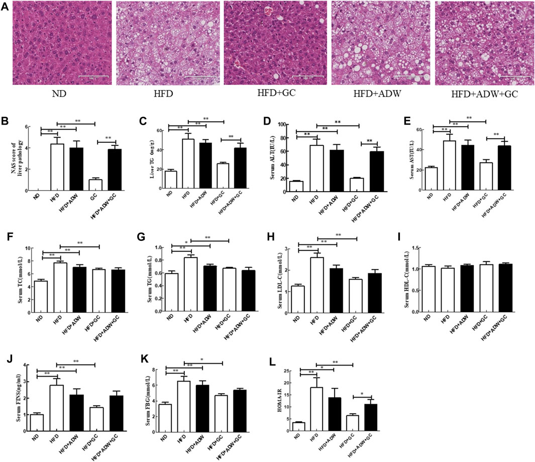 Figure 2. Changes in liver histology and biochemical indexes of liver and serum in a mouse NAFLD model and intervention with GC with or without ADW. (A) H&E staining, ×200. (B) Liver NAS. (C) Liver TG level. (D) Serum ALT level. (E) Serum AST level. (F) Serum TC level. (G) Serum TG level. (H) Serum LDL-C level. (I) Serum HDL-C level. (J) Serum FINS level. (K) Serum FBG level. (L) HOMA-IR. Abbreviations: NAFLD, non-alcoholic fatty liver disease; ND, normal diet; HFD, high-fat diet; ADW, antibiotic drinking water (containing ampicillin, neomycin, vancomycin, and tinidazole); GC, geniposide and chlorogenic acid combination treatment; NAS, NAFLD activity score; H&E, hematoxylin and eosin; TG, triglyceride; ALT, alanine aminotransferase; AST, serum aspartate aminotransferase; TC, total cholesterol; LDL-C, low-density lipoprotein cholesterol; HDL-C, high-density lipoprotein cholesterol; FINS, fasting insulin; FBG, fasting blood glucose; HOMA-IR, Homeostatic Model Assessment of Insulin Resistance. *p < 0.05 and **p < 0.01 (n = 8 per group).