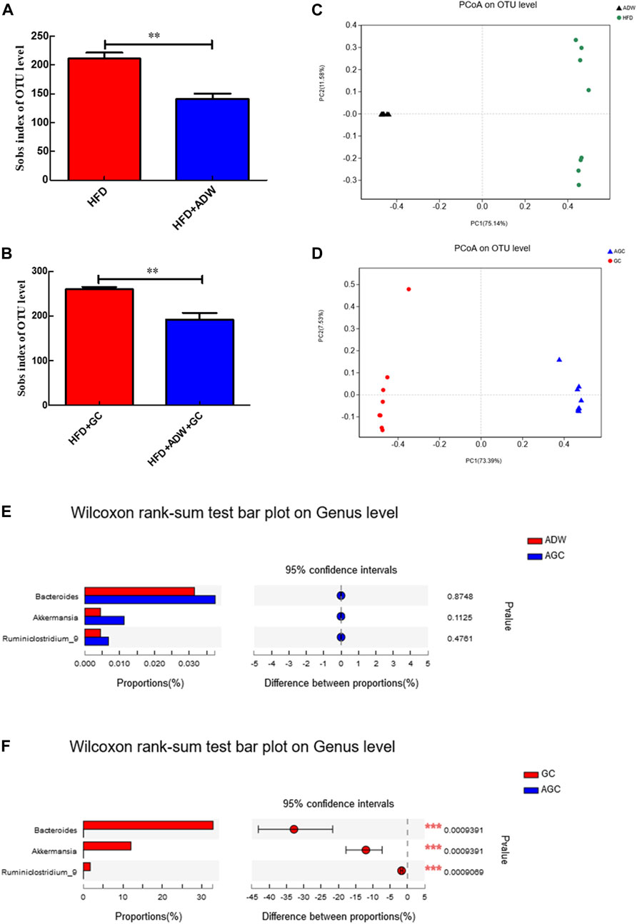 Figure 3. Changes in the gut microbiota and intervention with GC with or without ADW in a mouse NAFLD model. (A, B) Alpha diversit of the gut microbiota. (C, D) Beta diversity analyzed using PCoA of the gut microbiota in each labeled group. (E) Wilcoxon rank-sum test results of changes at the genus level between the ADW and AGC groups. (F) Wilcoxon rank-sum test results of changes at the genus level between the GC and AGC groups. Abbreviations: NAFLD, non-alcoholic fatty liver disease; ADW, antibiotic drinking water (containing ampicillin, neomycin, vancomycin, and tinidazole); GC, geniposide and chlorogenic acid combination treatment; ND, normal diet; HFD, high-fat diet; PCoA, principal coordinate analysis; OTU, operational taxonomic unit. **p < 0.01 (n = 8 per group).