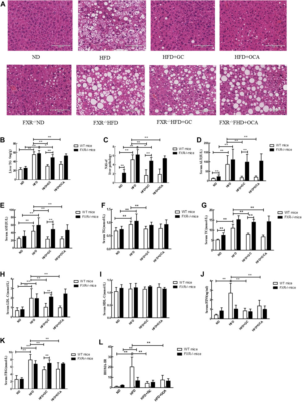 Figure 4. Changes in liver morphology, NAS and biochemical indexes with intervention of GC or OCA in wild-type and FXR−/− mouse NAFLD models. (A) H&E staining, ×200. (B) Liver TG level. (C) Liver NAS. (D) Serum ALT level. (E) Serum AST level. (F) Serum TG level. (G) Serum TC level. (H) Serum LDL-C level. (I) Serum HDL-C level. (J) Serum FINS level. (K) Serum FBG level. (L) HOMA-IR. Abbreviations: NAFLD, non-alcoholic fatty liver disease; ND, normal diet; HFD, high-fat diet; GC, geniposide and chlorogenic acid combination treatment; OCA, obeticholic acid; TG, triglyceride; NAS, NAFLD activity score; ALT, alanine aminotransferase; AST, serum aspartate aminotransferase; TG, triglyceride; TC, total cholesterol; LDL-C, low-density lipoprotein cholesterol; HDL-C, high-density lipoprotein cholesterol; FINS, fasting insulin; FBG, fasting blood glucose; HOMA-IR, Homeostatic Model Assessment of Insulin Resistance; WT, wild type; FXR−/−, FXR knockout. *p < 0.05 and **p < 0.01 (n = 9 per group).