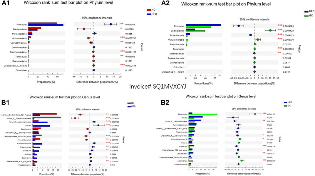 Figure 5. Changes in the gut microbiota and intervention with GC in a mouse NAFLD model. The gut microbiota data were analyzed by using the online Majorbio cloud platform (www.majorbio.com). (A1) Wilcoxon rank-sum test of changes at the phylum level. The data show the changes in the gut microbiota of mice in the HFD and ND groups at the phylum level. (A2) Wilcoxon rank-sum test of changes at the phylum level. The data show the changes in the gut microbiota of mice in the HFD + GC and HFD groups at the phylum level. (B1) Wilcoxon rank-sum test of changes at the genus level. The data show the changes in the gut microbiota of mice in the HFD and ND groups at the genus level. (B2) Wilcoxon rank-sum test of changes at the genus level. The data show the changes in the gut microbiota of mice in the HFD + GC and HFD groups at the genus level. Abbreviations: NAFLD, non-alcoholic fatty liver disease; ND, normal diet; HFD, high-fat diet; GC, HFD + geniposide and chlorogenic acid combination treatment. *p < 0.05, **p < 0.01, and ***p < 0.001 (n = 9 per group).