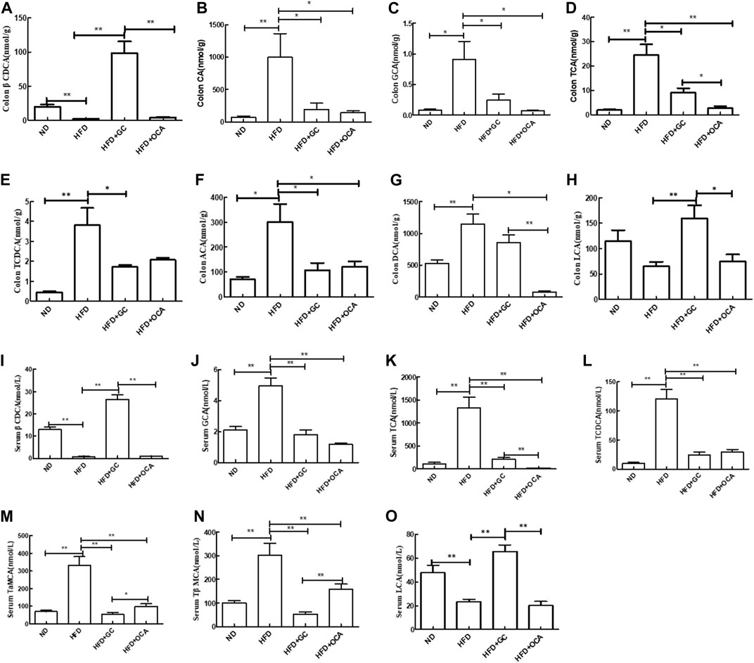 In addition, we tested the effect of obeticholic acid (OCA) treatment by using 36 SPF, male C57BL/6 mice weighing 16–20 g from Shanghai Silaike Experiment Animal Co., Ltd. (Shanghai, China). The experiments were performed in a barrier animal room of the Experimental Animal Center of Shanghai University of Traditional Chinese Medicine. The animals were randomly divided into ND (n = 9) and HFD (n = 27) groups, and the HFD model was established accordingly. At the 11th week, the HFD mice were further randomly divided into the following three groups: HFD control, HFD + GC, and HFD + OCA (n = 9 per group) and treated for 4 weeks according to a method described previously (Li et al., 2020). OCA was intragastrically administered at a dose of 10 mg/kg weight/day, according to a previous study (Li et al., 2020). The control mice were intragastrically administered an equal amount of drinking water for 4 weeks.