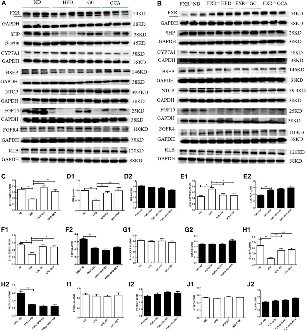 Figure 7. Changes in the liver tissue levels of FXR, SHP, CYP7A1, BSEP, FGFR4, NTCP, and KLB proteins and ileal tissue levels of FGF15 with intervention of GC or OCA in wild type and FXR−/− mouse NAFLD models. (A) Western blot picture of wild-type mice. (B) Western blot picture of FXR−/− mice. (C) Quantified data of FXR protein in liver tissues. (D1, D2) Quantified data of SHP protein in liver tissues. (E1, E2) Quantified data of CYP7A1 protein in liver tissues. (F1, F2) Quantified data of BSEP protein in liver tissues. (G1, G2) Quantified data of NTCP protein in liver tissues. (H1, H2) Quantified data of FGF15 protein in ileal tissues; (I1, I2) Quantified data of FGFR4 protein in liver tissues. (J1, J2) Quantified data of KLB protein in liver tissues. Abbreviations: NAFLD, non-alcoholic fatty liver disease; ND, normal diet; HFD, high-fat diet; GC, geniposide and chlorogenic acid combination treatment; OCA, obeticholic acid; FXR−/−, FXR knockout.*p < 0.05 and **p < 0.01 (n = 3 per group).