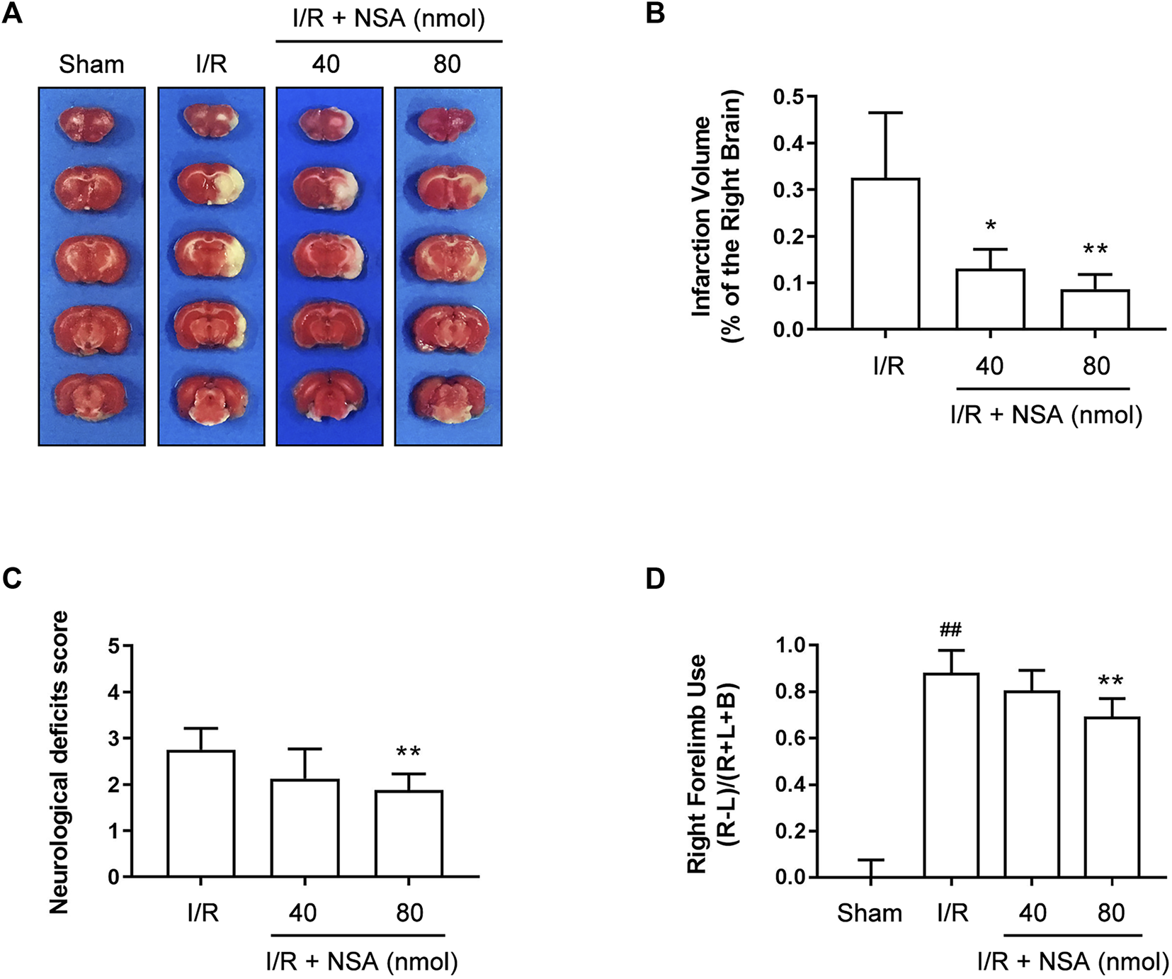 The protective effect of NSA against I/R-induced brain injury has been reported previously in mice (Zhou et al., 2017) but not in rats. To validate the neuroprotection of NSA against I/R-induced acute brain injury in rats, different doses of NSA (40 nmol, 80 nmol) was administrated intracerebroventricularly upon reoxygenation. As shown in Figures 1A, B, NSA at both 40 nmol and 80 nmol significantly decreased cerebral infarction volume compared to I/R group. Consistent with the reducing infarction volume, NSA at 80 nmol greatly decreased Neurological deficits score (Figure 1C) as well as right forelimb use (Figure 1D). Collectively, these data suggest that NSA produces neuroprotective effects against I/R-induced acute brain injury in rats. 80 nmol was chosen as the optimum dose of NSA for further experiments in vivo.