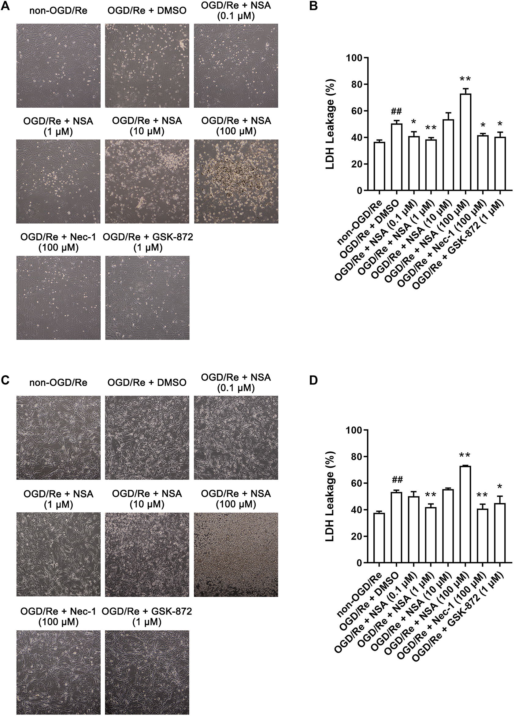 FIGURE 2. NSA protects primary cultured astrocytes and human astrocytes against OGD/Re-induced cell injury. Representative light microscopy images of (A) primary astrocytes and (C) human astrocytes exposed to OGD for 6 h or 3 h, respectively, followed by reoxygenation for 24 h. Primary astrocytes and human astrocytes were treated with different concentrations of NSA, Nec-1, GSK-872 or vehicle upon reoxygenation. (B) Columns represent quantitative analysis of LDH leakage in panel (A). (D) Columns represent quantitative analysis of LDH leakage in panel (C). N = 3 biological replicates. Data shown are the mean with error bars representing ±SD. ##p < 0.01 vs. non-OGD/Re group, *p < 0.05, **p < 0.01 vs. OGD/Re + DMSO group.