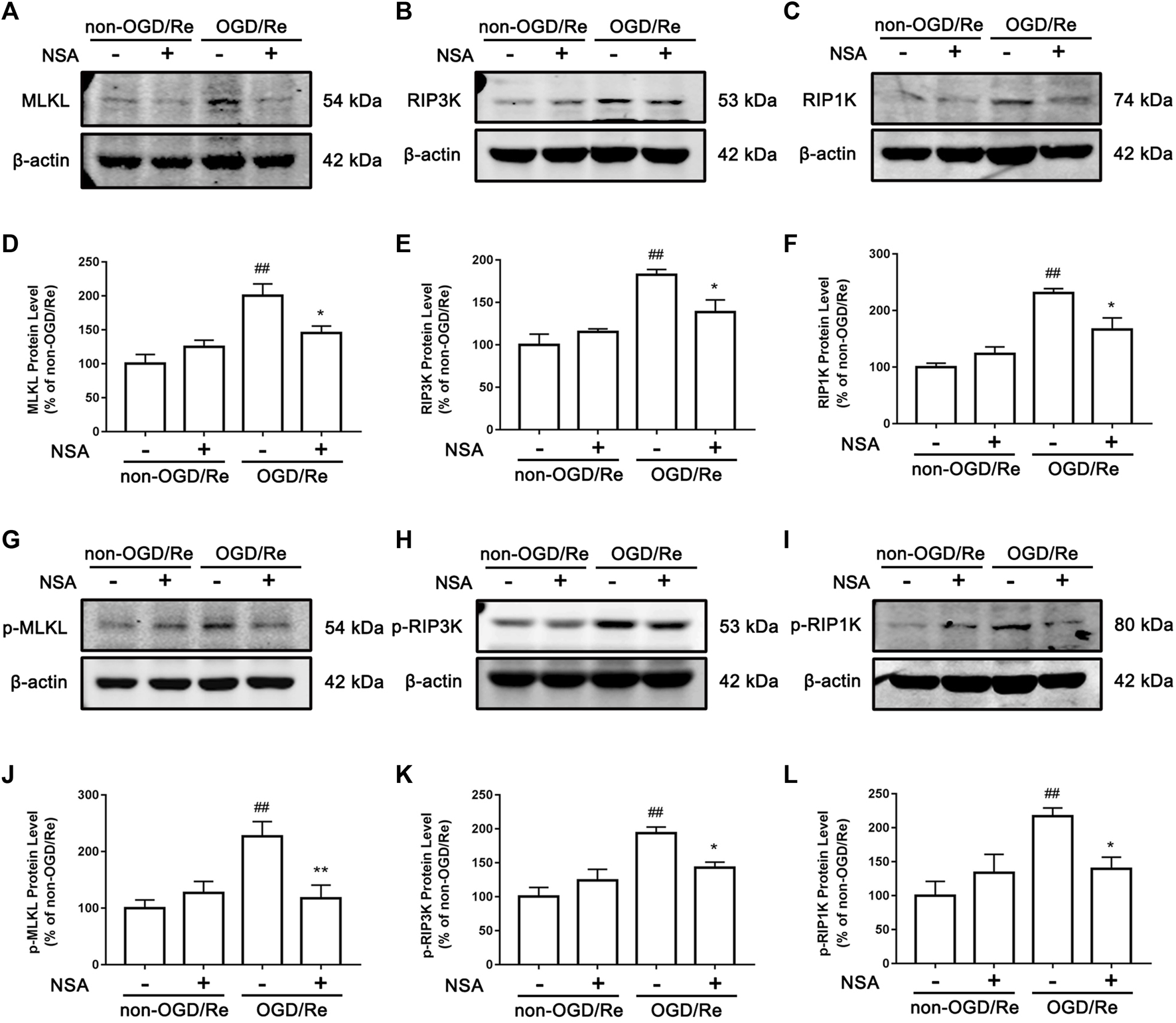 FIGURE 4. NSA inhibits the levels of necroptosis-related proteins. Primary cultured astrocytes from rats were exposed to OGD for 6 h followed by reoxygenation for 24 h. Western blotting analysis of the protein levels of MLKL (A), RIP3K (B), RIP1K (C), p-MLKL (G), p-RIP3K (H), and p-RIP1K (I). (D–F) Columns represent quantitative analysis of MLKL, RIP3K, and RIP1K. (J–L) Columns represent quantitative analysis of p-MLKL, p-RIP3K, and p-RIP1K. β-actin protein was used as a loading control. N = 3 biological replicates. Data shown are the mean with error bars representing ±SD. ##p < 0.01 vs. non-OGD/Re group; **p < 0.01, *p < 0.05 vs. OGD/Re group.