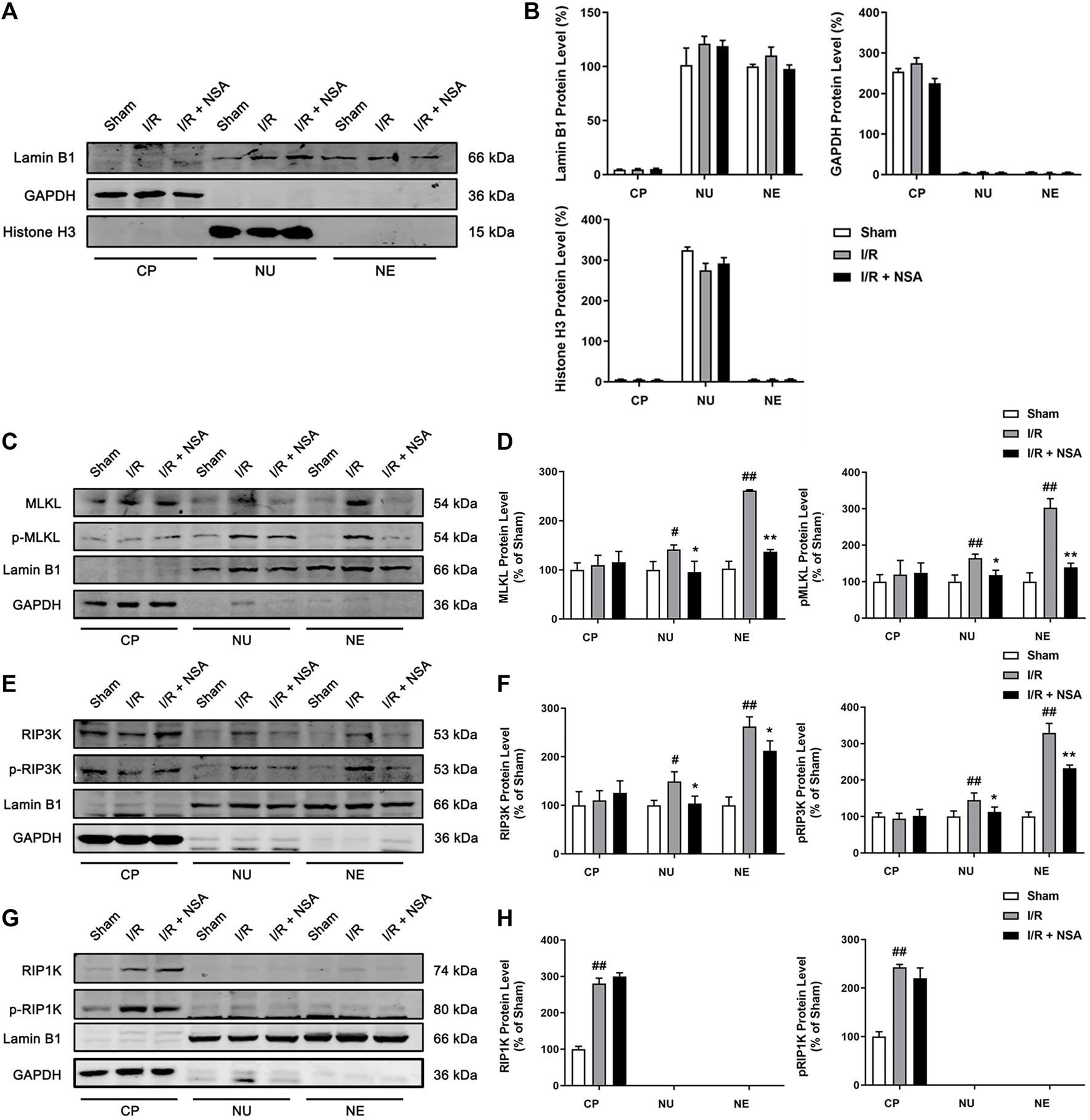 FIGURE 5. NSA blocks the nucleus and nuclear envelope localization of MLKL/p-MLKL, and RIP3K/p-RIP3K. (A, B) The identification for the extraction of cytoplasmic, nuclear and nuclear envelope proteins. Lamin B1, GAPDH and Histone H3 represents nuclear envelope, cytoplasmic and nuclear marker, respectively. Representative Western blotting images for the protein levels of (C) MLKL/p-MLKL, (E) RIP3K/p-RIP3K, and (G) RIP1K/p-RIP1K in the peri-infarct region at 24 h after reperfusion following cerebral ischemia for 90 min in rats. (D, F, H) Quantitative analysis of the protein levels in panel C, E and G, respectively. N = 3 biological replicates. Data shown are the mean with error bars representing ±SD. ##p < 0.01, #p < 0.05 vs. sham group; **p < 0.01, *p < 0.05 vs. I/R group. (CP: cytoplasm, NU: nucleus, NE: nuclear envelope).