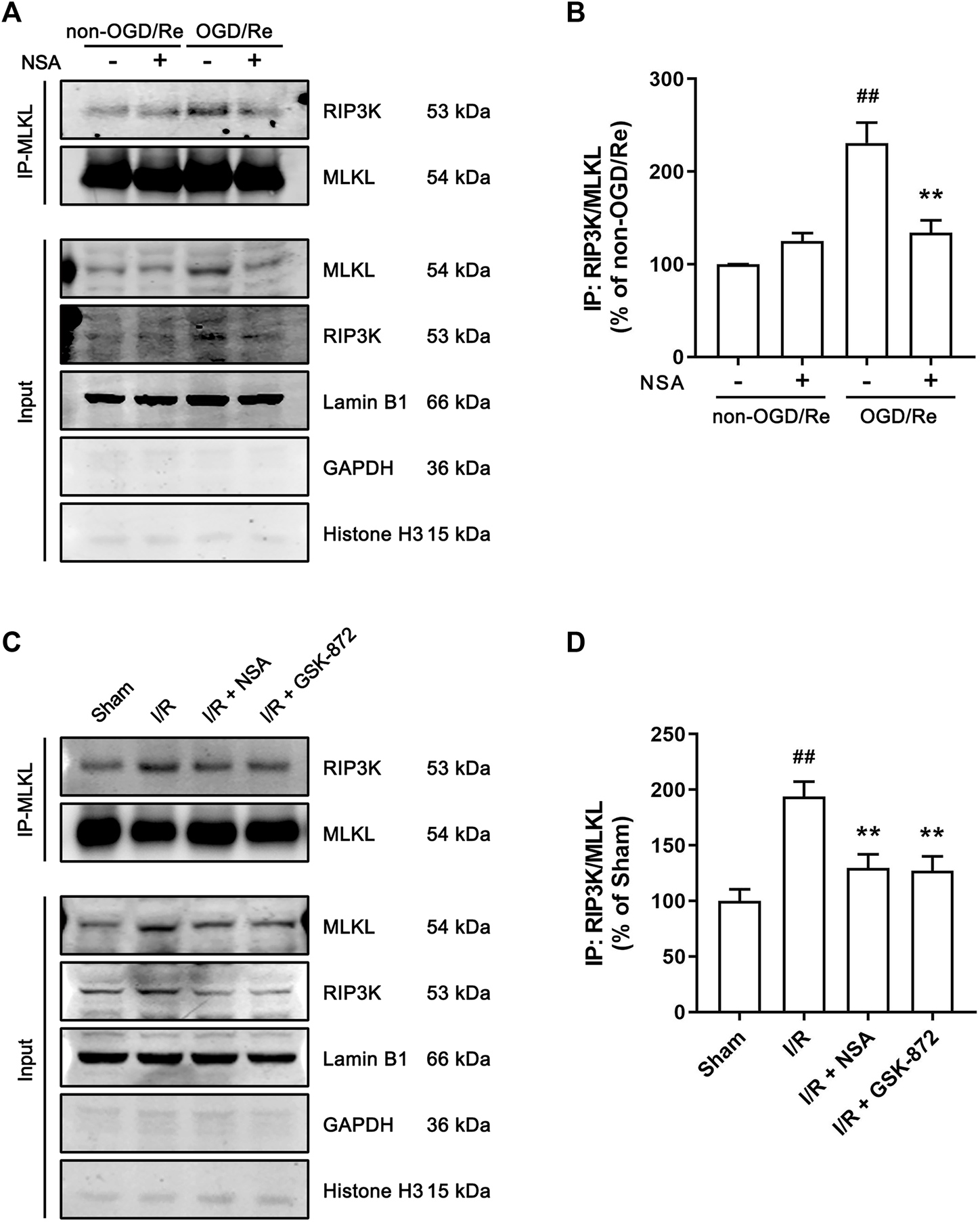 FIGURE 6. NSA reduces the combination of MLKL and RIP3K in nuclear envelope in both human astrocytes and ischemic penumbra of cerebral cortex. (A) Human astrocytes were exposed to OGD for 3 h followed by reoxygenation for 24 h. Co-immunoprecipitation of RIP3K with MLKL from the nuclear envelope extracts. Lamin B1, GAPDH and Histone H3 represents nuclear envelope, cytoplasmic and nuclear marker, respectively. (B) Columns represent quantitative analysis of immunoblots in panel (A). N = 3 biological replicates. Data shown are the mean with error bars representing ±SD. ##p < 0.01 vs. non-OGD/Re group; **p < 0.01 vs. OGD/Re group. (C) Mice subjected to tMCAO were treated with NSA or GSK-872. Co-immunoprecipitation of RIP3K with MLKL from the nuclear envelope extracts. (D) Columns represent quantitative analysis of immunoblots in (C). N = 3 biological replicates. Data shown are the mean with error bars representing ±SD. ##p < 0.01 vs. Sham group; **p < 0.01 vs. I/R group.