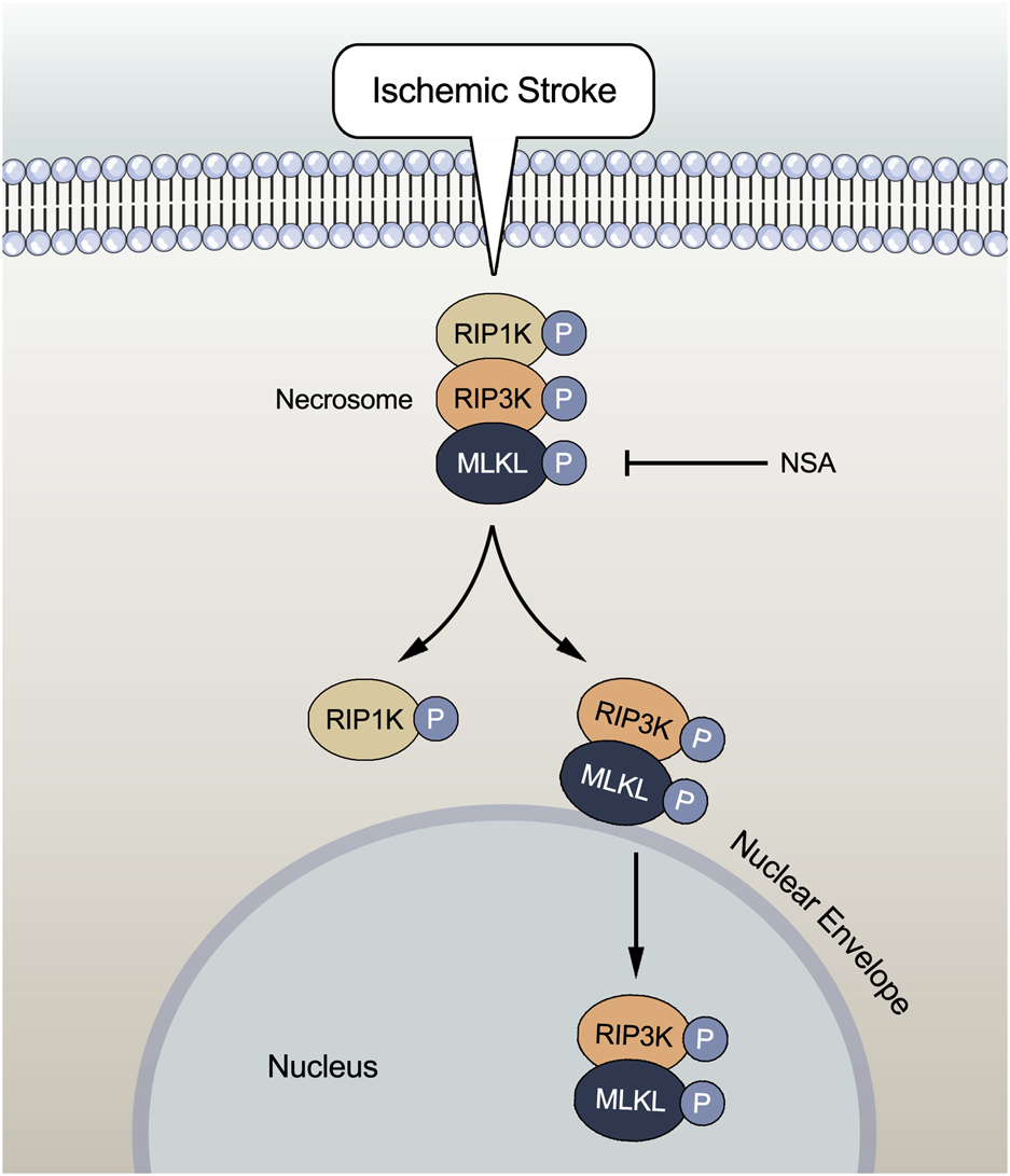 In summary, the current study provides important evidence that NSA exerts protective effects against focal ischemia/reperfusion injury through inhibiting necroptosis via preventing the upregulation of necroptosis kinases such as MLKL/p-MLKL, RIP3K/p-RIP3K, and RIP1K/p-RIP1K in ischemic penumbra of cerebral cortex and ischemic astrocytes, as well as blocking both the nucleus and nuclear envelope localization of p-MLKL and p-RIP3K. The translocation of p-MLKL, along with p-RIP3K, to the nuclear envelope and the nucleus may play a crucial role in MLKL-mediated necroptosis under ischemic conditions (Figure 7). How the nuclear complex of MLKL and RIP3K plays a role and whether the nuclear envelope co-localization of MLKL and RIP3K exerts independently at nuclear envelope in necroptosis after ischemic stroke remain to be investigated in the very near future.