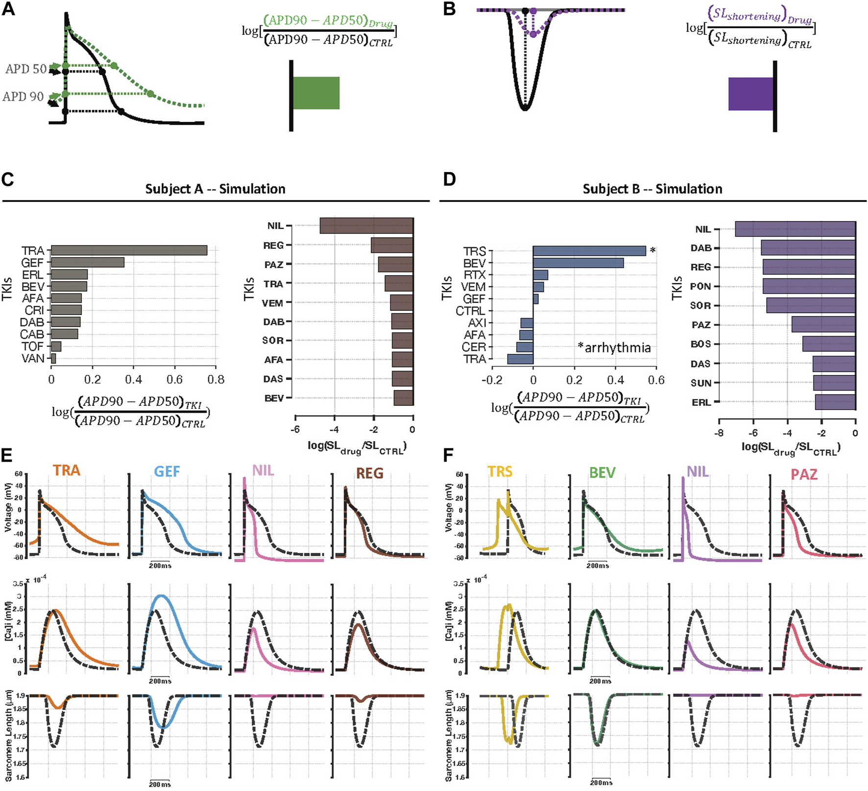 Individual specific predictions of physiological alterations caused by TKIs. (A) To examine TKI-induced effects on electrophysiology, we computed triangulation of AP waveforms from the simulation output for each drug. In the diagram, the green curve, representing drug-induced changes, shows a more triangular waveform than the black curve, representing the baseline model, which indicates an increase in triangulation. (B) TKI-induced contractile dysfunction was evaluated using sarcomere length shortening simulation results. Because the drug-treated purple curve exhibits reduced shortening compared with the black (control) curve, this change is summarized as a decrease in contraction strength. (C, D) Individual specific, top 10 rankings for log-transformed AP triangulation and contractile failure metrics. Amongst the top 10 most highly-ranked TKIs, there was higher level of correlation between subject A and B in contractile dysfunction (Spearman’s rank correlation, ρ = 0.64, p = 0.054) than AP triangulation rankings (ρ = -0.16, p = 0.65). (E, F) Example AP, CaT, and SL shortening simulation results in the two cell lines showing examples of drug-induced AP triangulation and contractile failure. Dashed black curves represent untreated cells, and colored lines represent predictions for, from left to right, trametinib, gefitinib, nilotinib, and regorafenib in Cell Line A, and trastuzumab, bevacizumab, nilotinib, and pazopanib in Cell Line B.